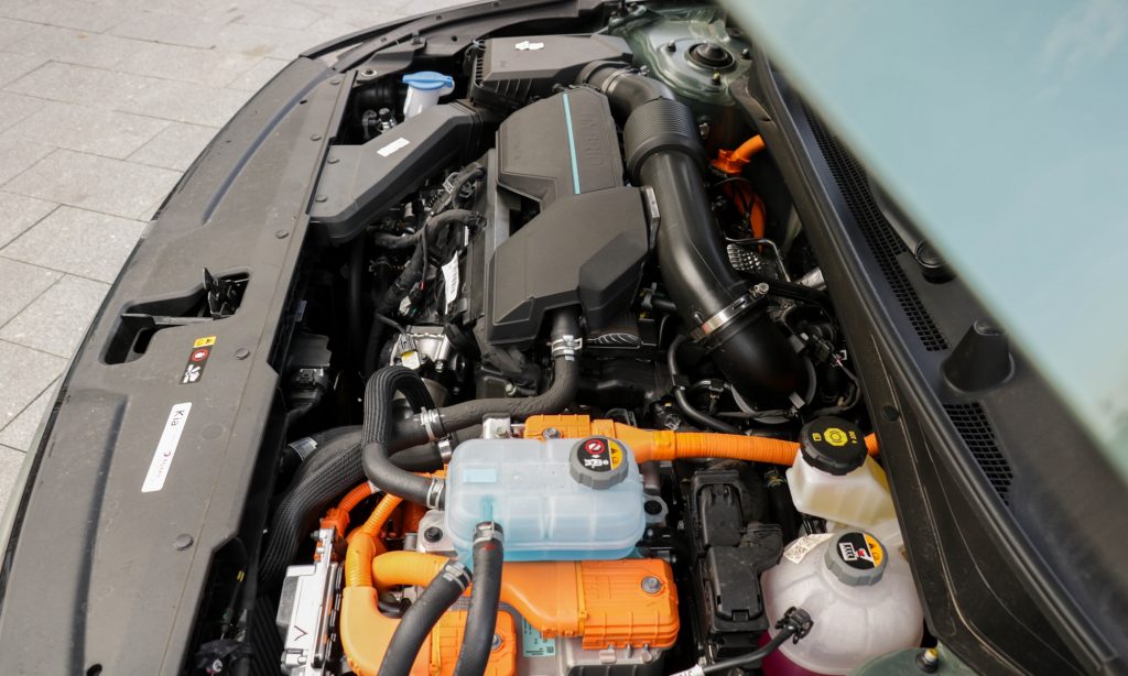 A hibridtechnika egyik legnagyobb szuperereje pont az, hogy gázadáskor az elektromos segédhajtás nagy nyomatékával kényelmesen át lehet hidalni azt az időt és erőhiányt, amíg a benzinmotor vezérlése kiszámolgatja, hogy mennyi benzint kell mennyi levegővel összekeverni az erőteljes, de azért Euro 6-os gyorsításhoz és végre elkezd dolgozni a belsőégésű motor. Ezért is használja ki számos gyártó (Toyota, Ford, vagy egyébként más modelljeivel a Kia is) a hibridrendszereknek azt a lehetőségét, hogy pörgős, agilis motor helyett egy szűk fordulatszám-tartományban erős, viszont nagyon takarékos és tartós konstrukciót épít be a villanymotor mellé.