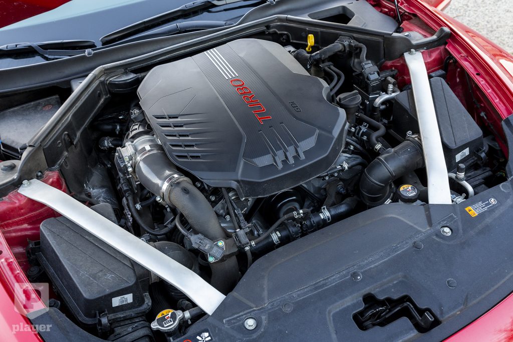 A Római Birodalom óta tudjuk, hogy a népjólét egyik eleme a cirkusz, szegény autótesztelő nem tehet mást, ha kíváncsi pillantások pásztázzák, mint hogy nyom egy padlógázt. A leggyengébb, dízel Stinger is 200 lóerős, 7,6 másodperces gyorsulásra képes, a tesztautóba viszont a háromtagú motorkínálat másik végletének számító 3,3 literes, V6-os biturbó került, amelyhez négykerék-meghajtás jár, nem csak a nyolcfokozatú automata, amely minden változathoz alap. Ez a 3.3 T-GDI nevű motor