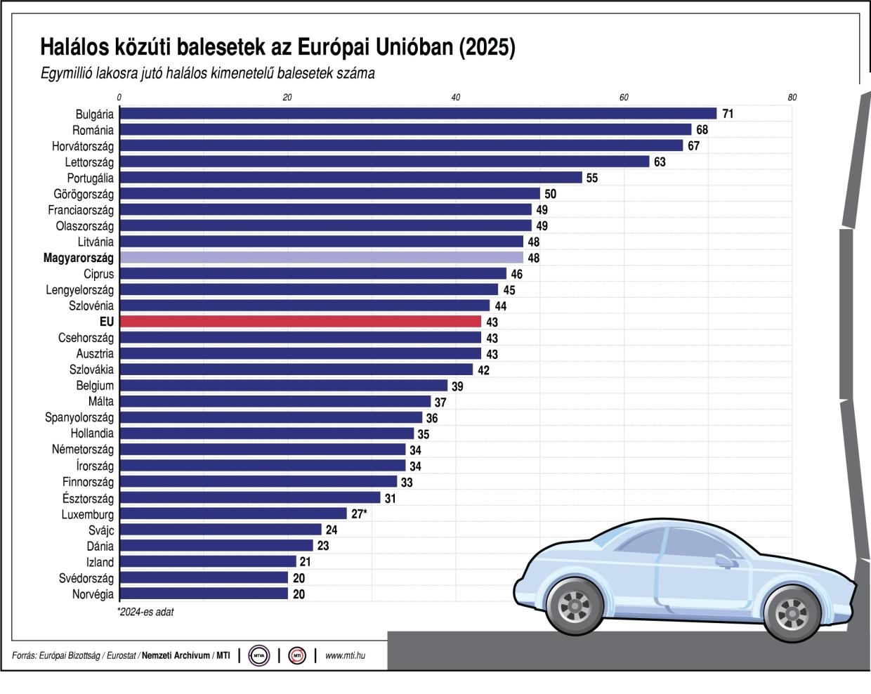A jelentés szerint továbbra is Svédországban és Norvégiában a legbiztonságosabb a közúti közlekedés, az országban tavaly egymillió lakosra vetítve 20 haláleset jegyeztek fel, Bulgáriában a legrosszabb a helyzet, ott 71-et. Az EU-s átlag 43, Magyarország kicsit rosszabb ennél, egymillió emberből 48 halt meg közúti balesetben.