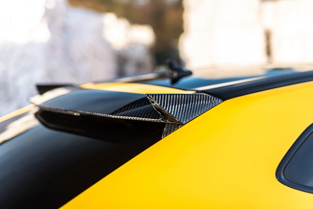 Jobban megnézve azért láthatod róla, hogy ez nem a szériamodell, ott vannak a szénszálas anyagból készült sárvédő-szélesítések, küszöbök és szárnyak, a karosszérián végigvonuló csík és a 21 colos kerekek is.