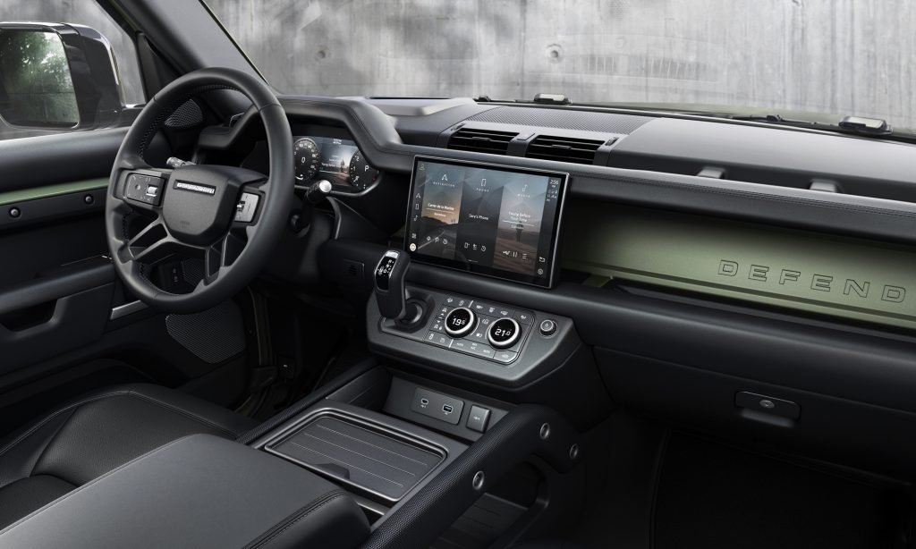 11,4 hüvelykes érintőképernyő trónol a középkonzolon, szélvédőre vetítő kijelző és vezeték nélküli töltő is van az autóban. Ez már távolról sem az a nomád Defender, amivel kalapos kalandorok felfedezik a világ eldugott zugait.