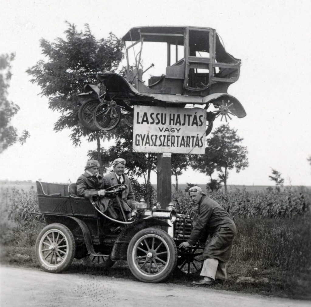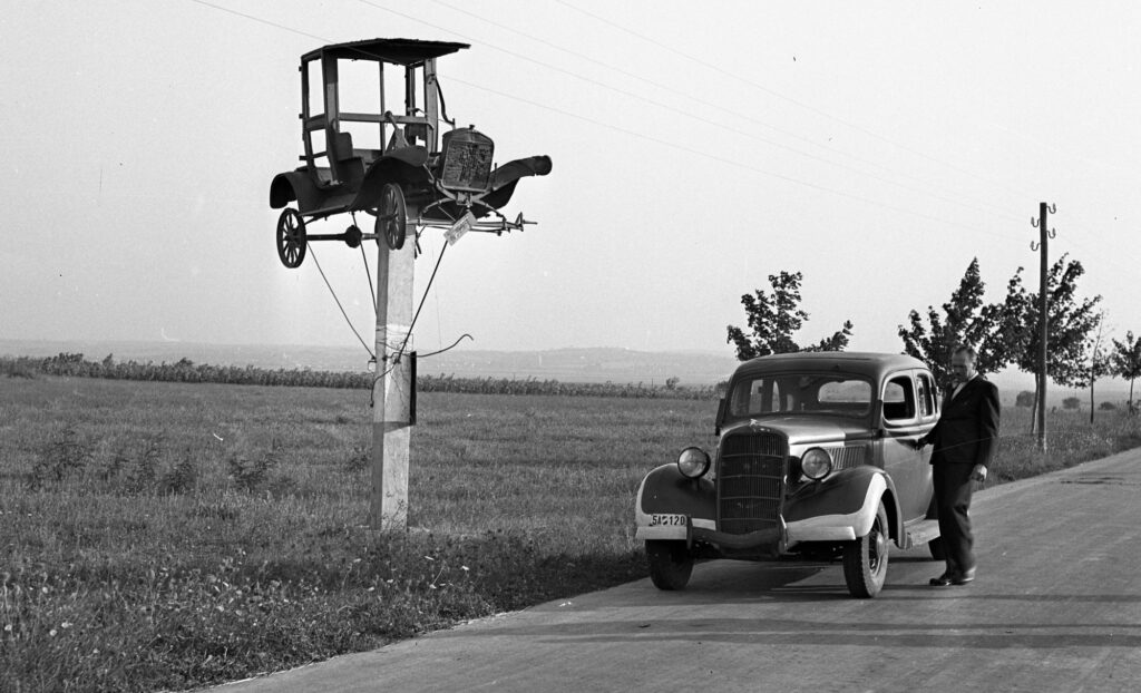Új feliratot kapott – SZABÁLYOS KÖZLEKEDÉS VÉD A BALESET ELLEN –, de aztán az is eltűnt, az amúgy sem komplett T-Ford egyre több alkatrészét vesztette el, majd a háborúban találatot kapott az oszlop, a maradék autó leesett, és annak is nyoma veszett.