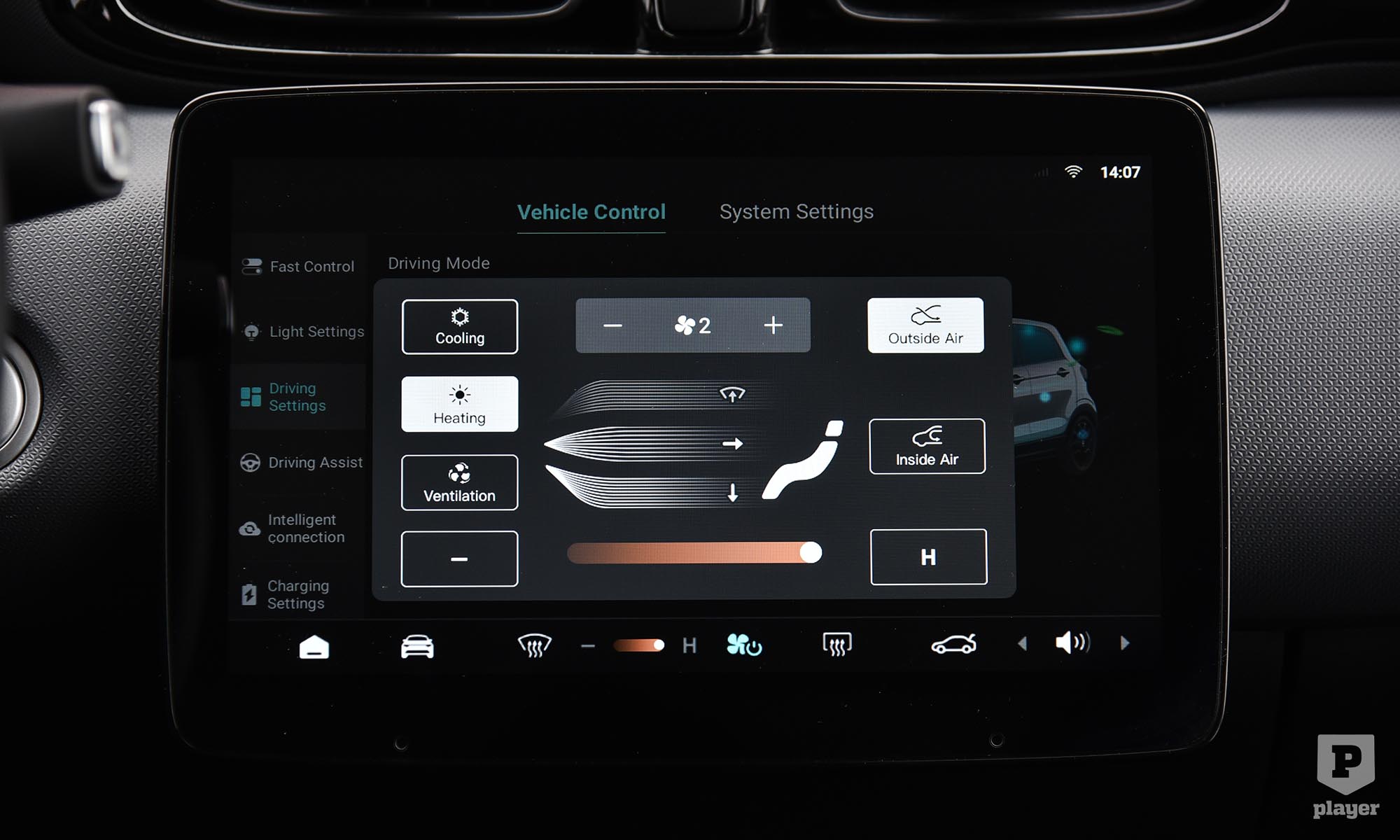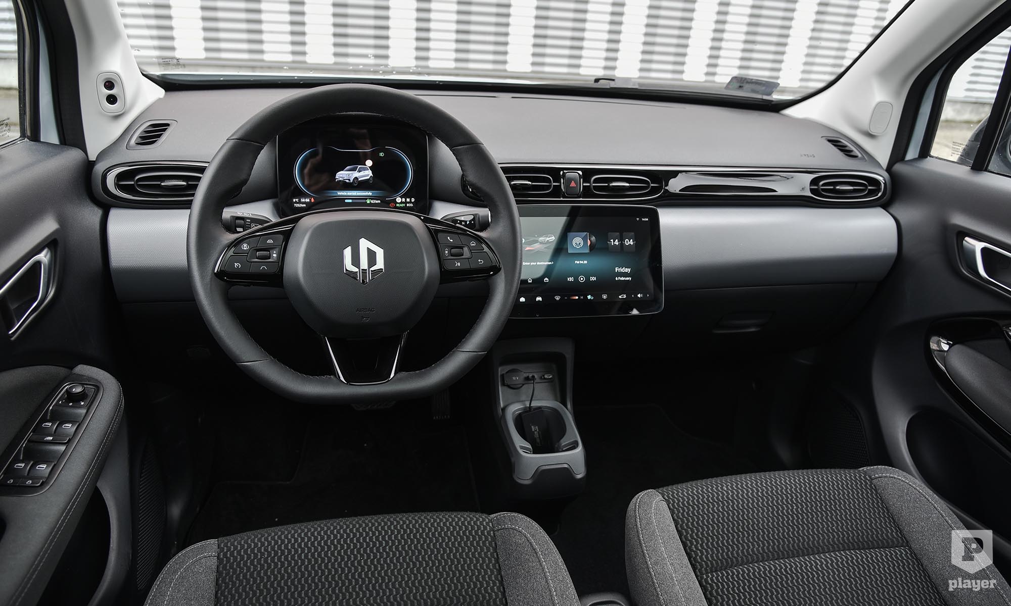 A műszerfal egyszerű, a kormányon kívül a két kijelző és a szellőzők csíkja a meghatározó elem. Jó, hogy nem esett a spórolás áldozatául a többek között a sebességet és a hatótávot jelző 8 colos LCD, a központi, 10,1 colos érintőképernyőt pedig nem is fenyegette veszély, mert még a fényszórókat is csak azon tudjuk vezérelni. A már említett Grande Panda infotainmentjéhez képest igazán komoly, nagyautós a menürendszer, beállíthatjuk, hogy hány százalékig töltődjön az aksi, milyen funkciója legyen a kulcs konfigurálható gombjának, választhatunk vezetési, sőt kormányzási módot is. Sajnos a hőfokot nem, csak egy csúszkát tolhatunk jobbra, ha fázunk, és a ventilátorfokozatot kapcsolhatjuk fel max. hetesre, de még plusz egy-két fokos külső hőmérsékletnél sem érhetjük el, hogy levehessük a kabátot. Nem csoda, a befújás a legnagyobb fokozaton is gyenge – legalább nem hangos a ventilátor –, a beáramló levegő pedig jóindulattal is csak langyosnak mondható.
