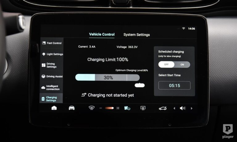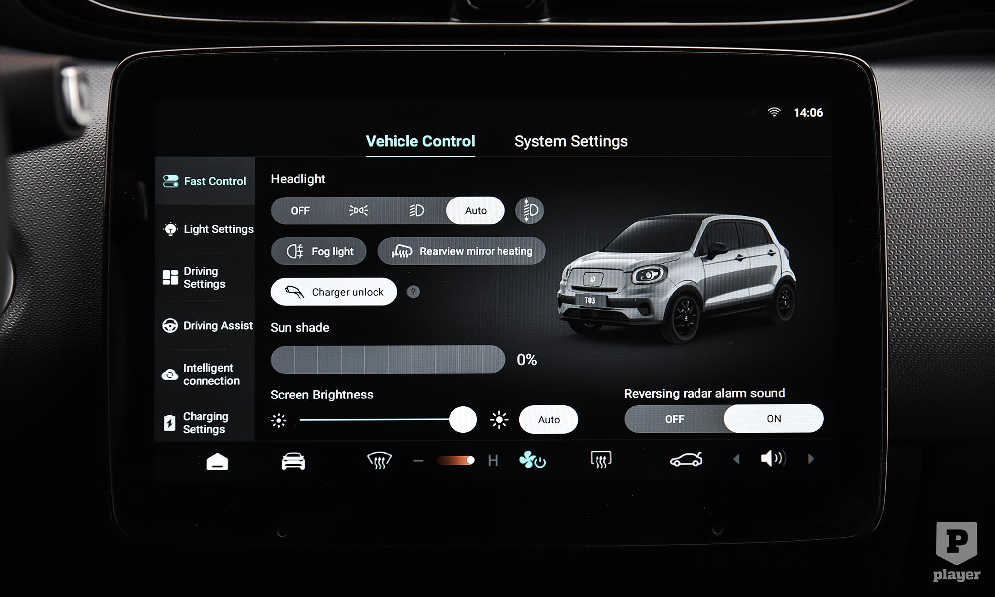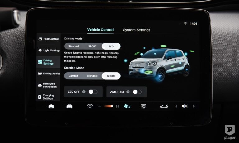 Vegyük végig gyorsan, mi nincs még a rendes fűtésen kívül! Magyar nyelvű menü – ez akkor lenne dráma, ha kínaiul lenne minden, de több más nyelv mellett angol is van. Hátsó ablaktörlő – nagyon hiányzik, ilyen meredek szélvédő trutyis időben azonnal átláthatatlanra koszolódik. Telefontükrözés – az importőr egy utólag bedugott eszközzel orvosolta a problémát, a Waze működött is, a telefonálás csak annyiban, hogy én hallottam, ahogy hallóznak a másik oldalon, mert a mikrofont valahogy életre kellett volna kelteni. Kilátás hátrafelé és hátra-oldalra – tolatásnál segít a kamera, sávváltásnál pedig a holttérfigyelő, utóbbi viszont forradalmi módon nem a külső visszapillantóknál jelez, hanem a műszerfalon, amit jó esetben épp sávváltáskor nem nézünk. De csipog is, mint annyi minden más asszisztensrendszer.