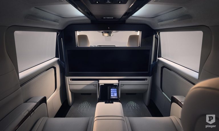 Kisbuszhoz méltón hat- és hétüléses változatban is készül az LM, de a legérdekesebb a négyüléses kivitel, ahol két extra kényelmes fotel került a hátsó térbe. A hátul utazókat üvegfal választja le, amire egy 48 colos képátlójú tévét szereltek, de a hűtőszekrény, a prémium hifi és a hangulatfény sem maradt el.