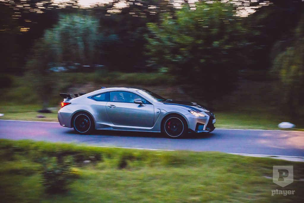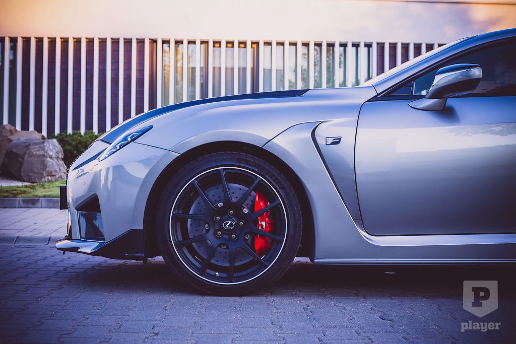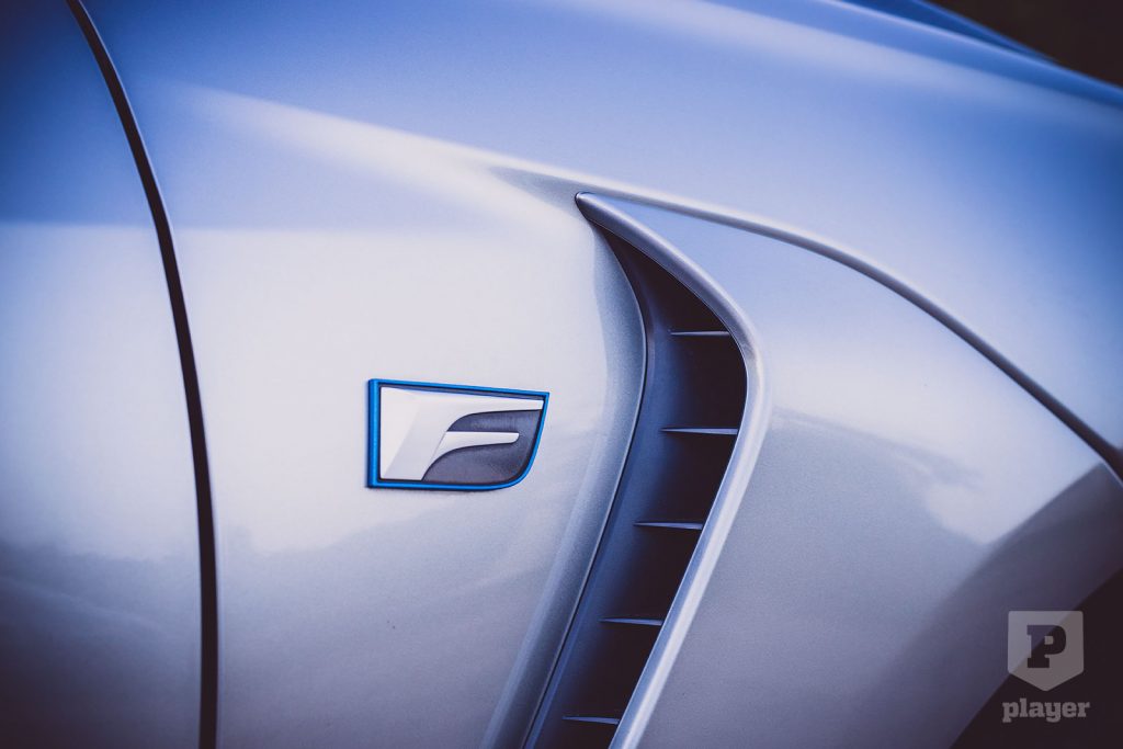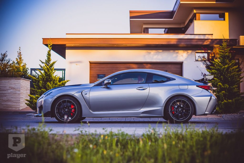 Az előd kétrészes fényszóróegysége egybefolyt a ráncfelvarrásnál, de így is kellően szigorú, mintha a lámpák belső sarka nyomta volna össze a hatalmas hűtőmaszkot, amelynek hatalmassága egyébként jól áll a kocsinak. Oldalnézetből a már emlegetett motorháztető elejének hirtelen zuhanása a legfurcsább, ebből érzékelhető, hogy amúgy milyen magasan is húzódik – kicsit szokatlan, de az RC F-en ez is rendben van.