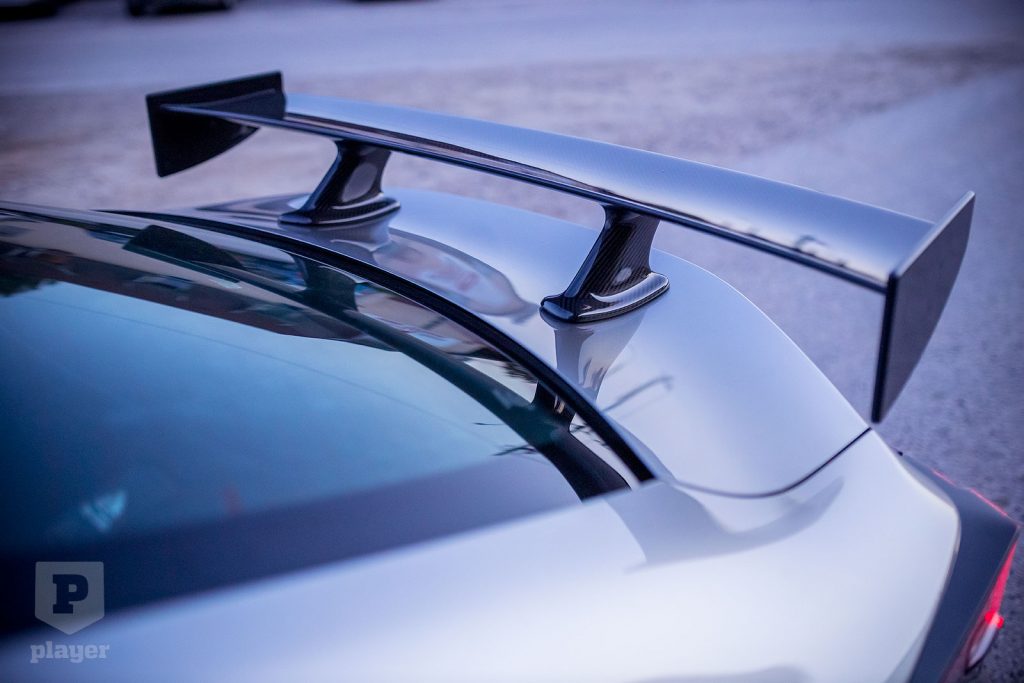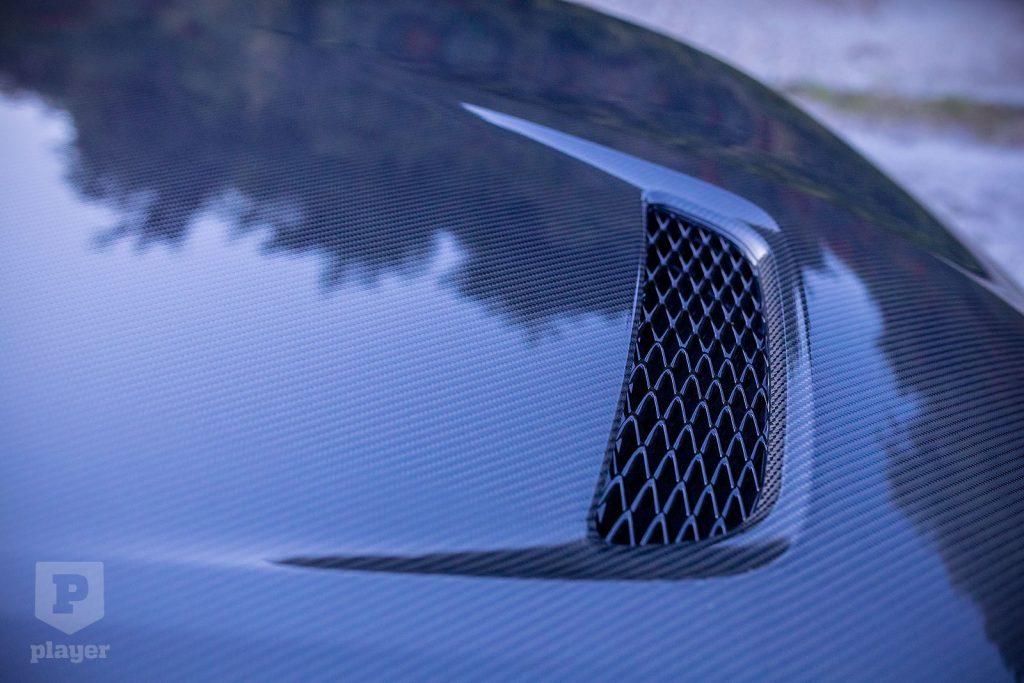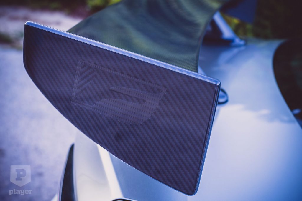 A képeken látható kocsi pedig azért tűnik egy tévedésből felrendszámozott versenyautónak, mert ez a Track Edition. Noha egy ekkora hátsó szárny a legegyszerűbb módja paródiává változtatni szinte bármilyen autót, itt nem ez a helyzet. Megvan a képesség, ami a paródiáknál soha, az alapból elég vad külső pedig nemhogy elbírja ezt a vizuális fokozást, de szinte kívánja is. Ráadásul az egyébként huszonhat kilós leszorítóerőt biztosító szárny mellett vannak még figyelemreméltó elemek, amilyen a négy kipufogóvég. Ami kevlárnak látszik, az is – rossz hír a tuningboltokban ahhoz hasonló fóliákat vásárló, majd ragasztgató lelkeseknek, hogy észrevehető a különbség –, az egész motorháztető abból van, de még így is meglepő a felnyitásakor, mennyire könnyű. A tetőt nem emelgettük külön, de a két elem nagyjából hetven-nyolcvan kilós tömegcsökkentést eredményez, ami motorsportmércével hegynyit jelent.