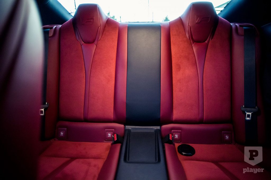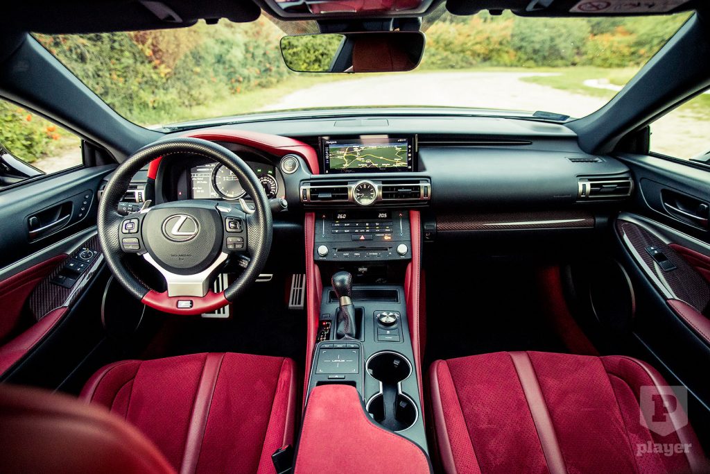 A belső nagyot üt, a vörös Alcantara-vörös bőr sportülés, a vörös-fekete szőnyegezés és a vörös-fekete műszerfal egyszerre hozza a sportosság és a luxus érzetét – a fedélzeti infotainment rendszert azonban sajnos nemcsak nézni kell, hanem vezérelni is, arra pedig a tapipados megoldás ugyanúgy nem alkalmas, ahogy a többi Lexusban sem. Érezhető, hogy a Lexus ebben különbözni akar a konkurensektől, és ez sikerül is, mert azok jók.