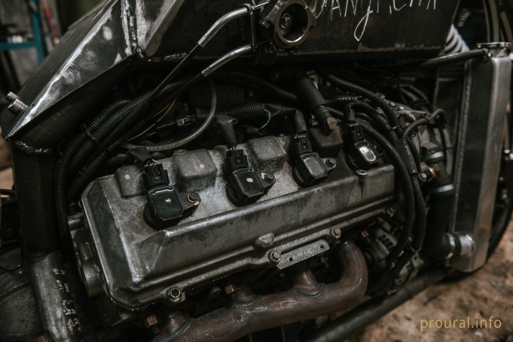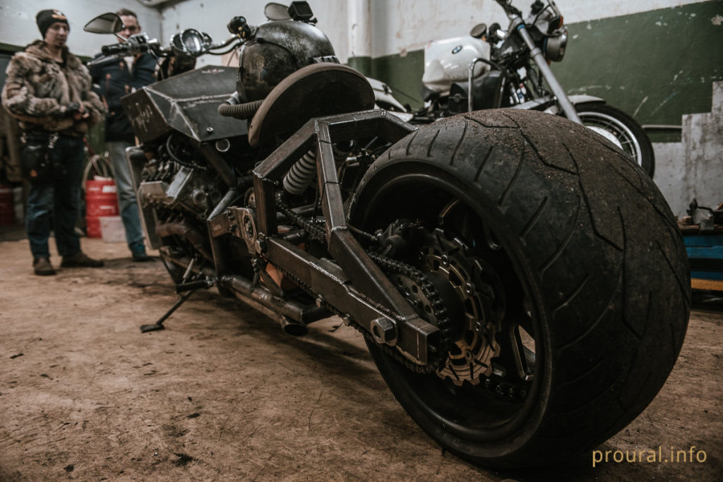 Jekatyerinburgban néha feltűnik egy szörny, vagy ha a különleges öltözékű motorost is nézzük, akkor kettő. A felső építette az alsót egy Lexus 300 lóerős V8-as motorját felhasználva: látta, hogy Amerikában van hasonló, hát ő is csinált egyet.