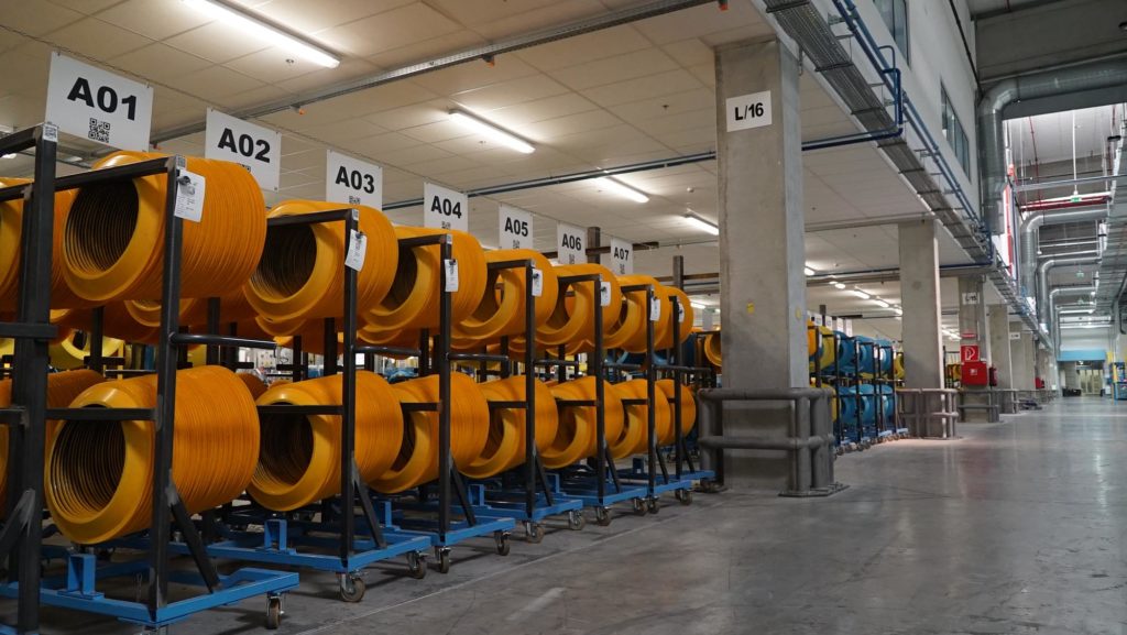 Ennek megfelelően mindenhol óriási rolnik vannak, amerre csak nézel, embermagasságú gumi- és szövettekercsek, amelyekből aztán az abroncsok születnek.