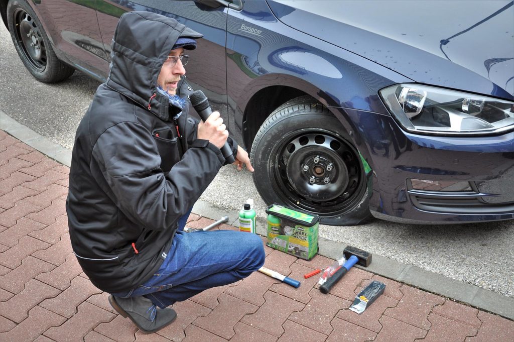 A teljesen egyforma Golfok közül az elsőn hagyományos abroncs volt, ami a légnyomásból vesztve csúnyán kilapult. Ilyen látvánnyal neked sem jutna eszedbe, hogy tovább menj. Ott voltak már bekészítve a kerékcsere eszközei, a kerékkulcs és a defektjavító, lehetett választani, hogy melyikkel szeretnénk továbbjutásra alkalmassá tenni a kocsit, de valahogyan nem akadt jelentkező. Kereket cserélni senki sem szeret.