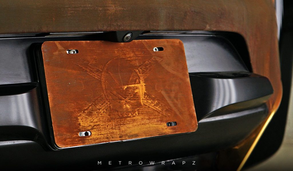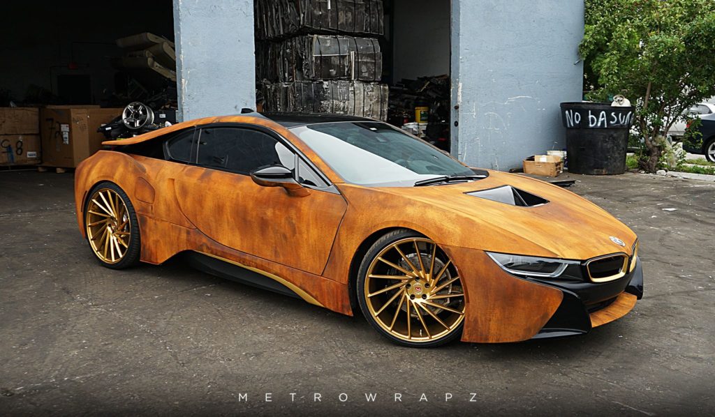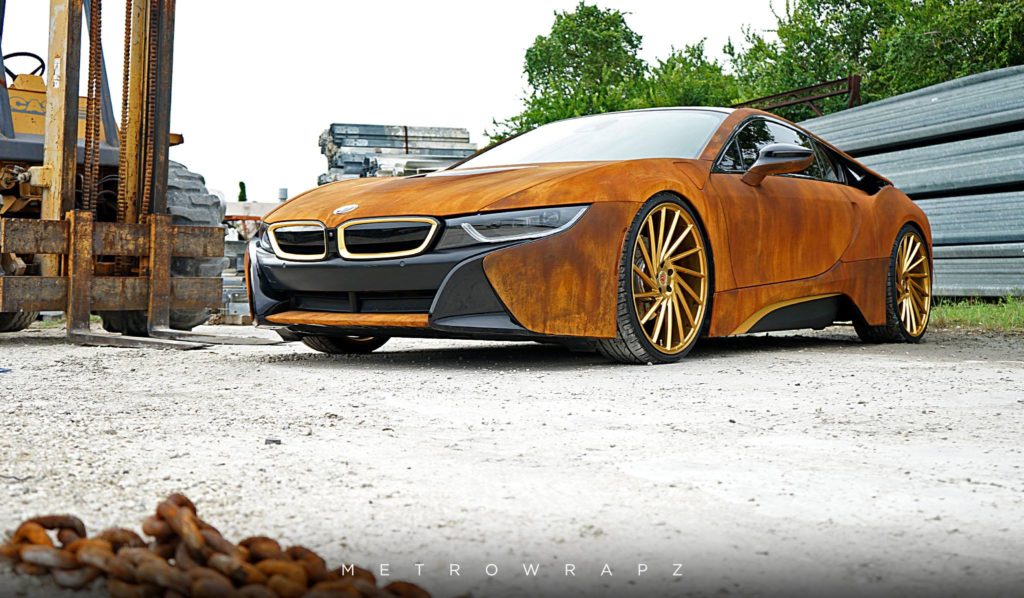 A srácnak egy évbe sem telt, hogy ráunjon a piros BMW-re, ezért az i8 nemrég ismét a fóliázó műhelyben kötött ki, ahol ezúttal valami igazán egyedi született: az autót tetőtől talpig rozsdaminta borítja. Persze aki ismeri a BMW hibrid sportkocsiját, az tudja, hogy a karosszériaelemek szénszál-erősítésű polimerből készültek, ezért az i8 valójában akkor sem nézne ki így, ha száz évre a sivatagban hagynád.