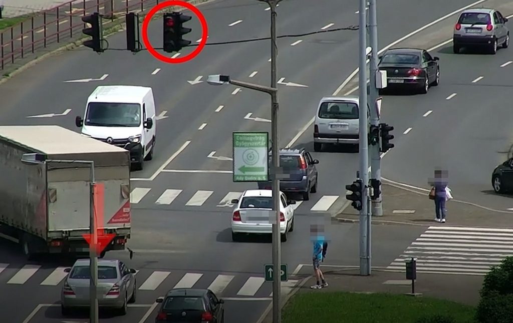 A közreadott videón az látszik, ahogy egy megkülönböztető jelzés nélkül drónnal lefülelik egy pirosban kanyarodó S-Mercedes vezetőjét.