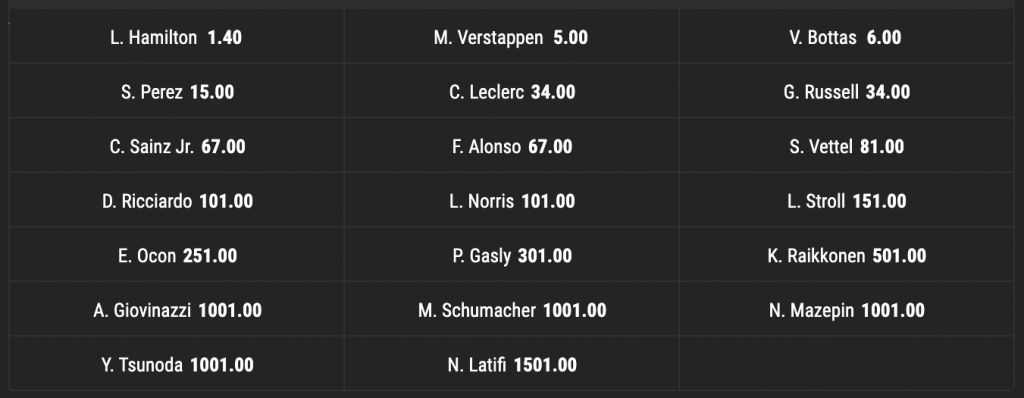 Az élen nincs semmi meglepő Lewis Hamilton történelmi nyolcadik világbajnoki címéért 1,4-es szorzót adnak. Mellette a Red Bull-os Max Verstappent és a mercedeses csapattársát, Valtteri Bottast tartják a legesélyesebbnek – előbbi sikerét 5-ös, utóbbiét 6-os szorzóval adják.