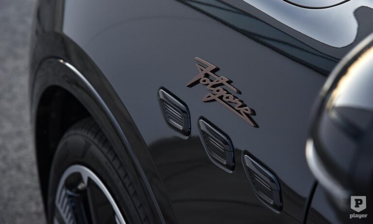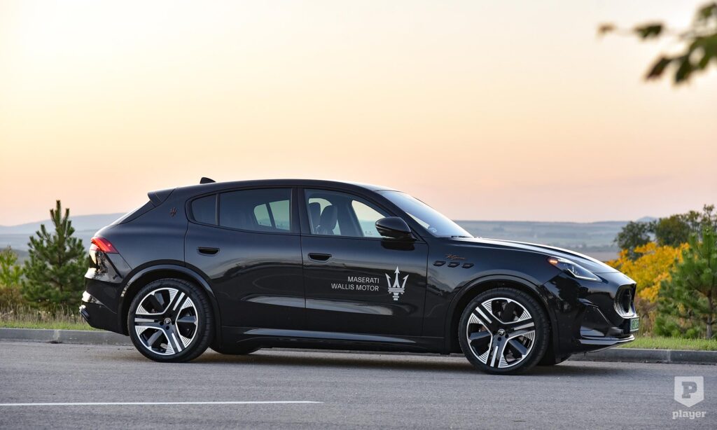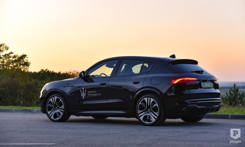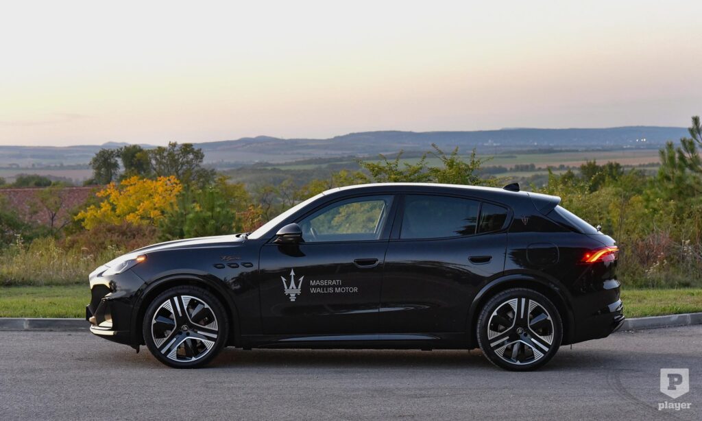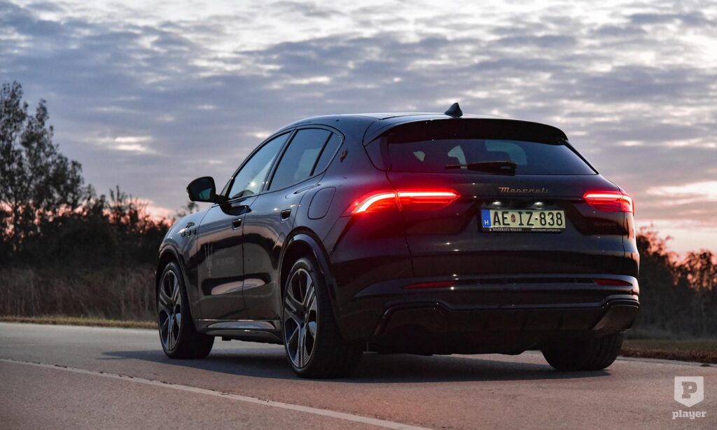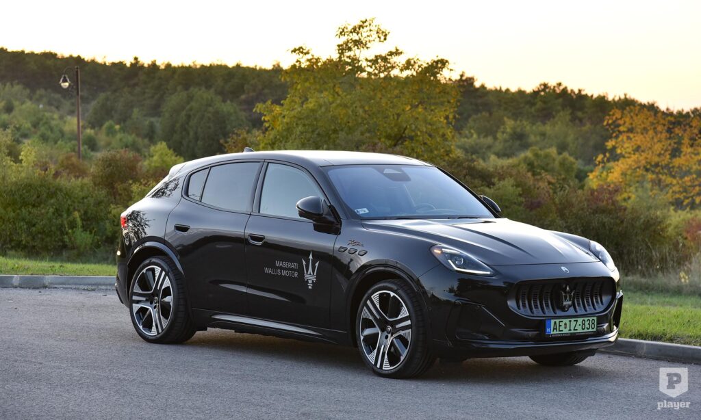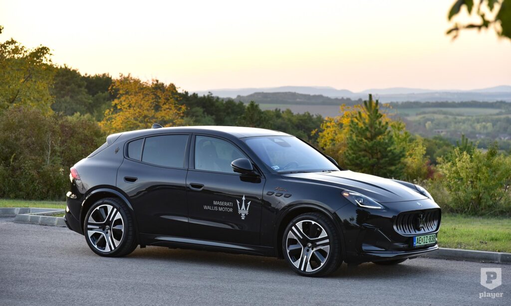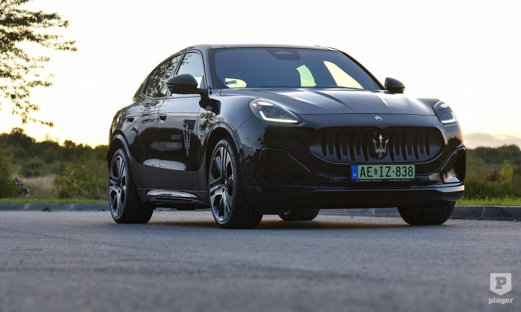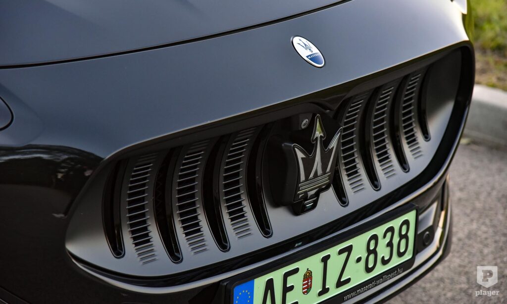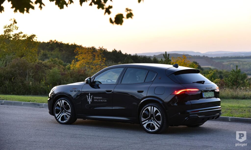 Bronzszínben pompáznak a feliratok a telt fekete karosszérián, és még ebben a részleteket rejtő sötét színben is rettentő jó kiállása van az elektromos Grecalénak, ami szabadidő-autóhoz mérten laposan ül a kerekein. Nem hiába, az arányokat akkor is nagyon érzik a Maseratinál, amikor elektromos autót fejlesztenek, és szerencsére a Folgore nem akart minden áron futurisztikus lenni, ezért egy ennyire stílusos autóval egy kicsit könnyebb lesz a benzines autóról elektromosra váltani. Persze nem lesz egyszerű dolga, mert az új, elektromos Porsche Macan is ott van a rajtvonalon.
