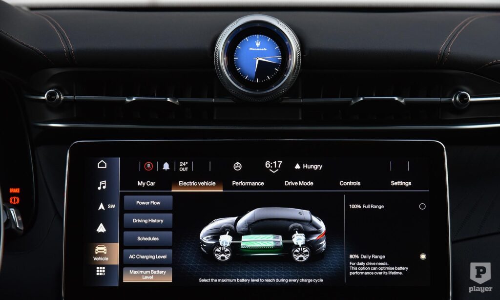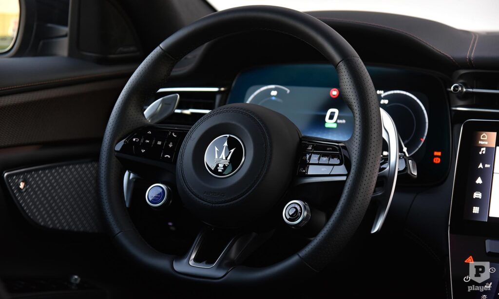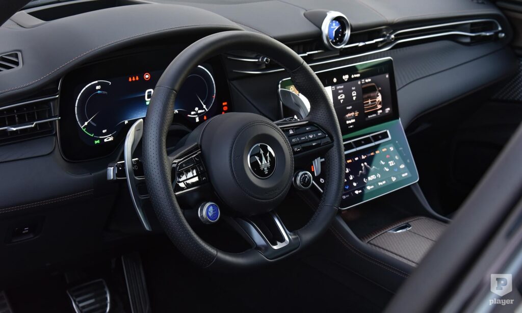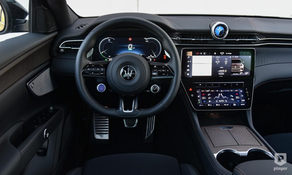 Berendezésével már a benzines Grecale is nagy lépést tett a digitalizáció felé, és ezt a műszerfalat veszi át az elektromos Folgore is, ami ezzel stílusos átmenetet jelent a múlt és jövő között. Számlapjait már 12,3 colos kijelző vetíti, ahogyan a középkonzolról sem maradhat el a hasonló méretű érintőképernyő, és a klímaberendezésnek is jutott egy külön kijelző. Még a Maserati hagyományos órája is digitálisra váltott, ezért már nem csak az időt mutatja, hanem többféle funkciójú számlap közt válthatunk, g-erőket, pedálállást is le lehet kérni ide.