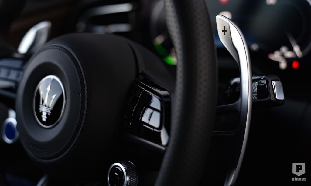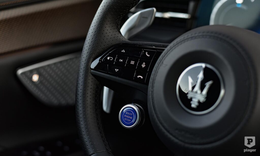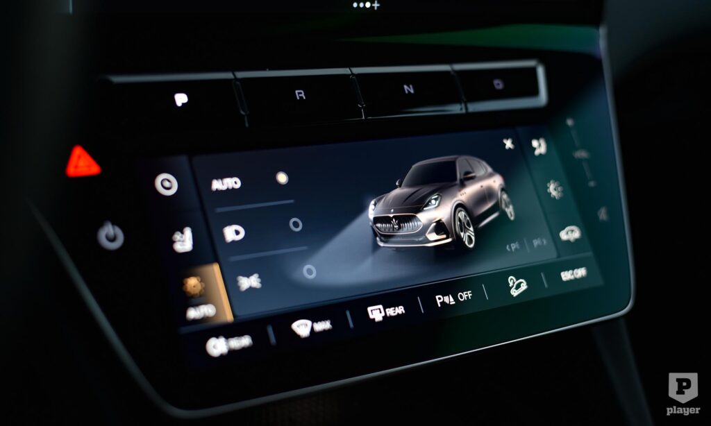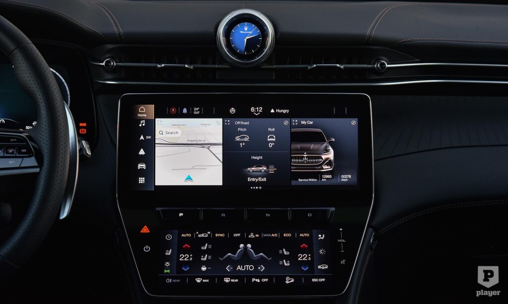Csak egy pár furcsaságot kell megszokni az elektromos Maseratiban. Már a beszállás sem szokványos, a süllyesztett kilincseket elég megérinteni, és belülről is gombnyomásra nyílnak az ajtók, mint az elektromos Fiat 500-ban. A világítást kapcsolni és az üléseket állítani a klímának szánt képernyőről lehet, és már a benzines kivitelben sem volt hagyományos értelemben vett váltókar, az irányt a középkonzolon lévő, egymás mellé tett gombokkal lehet kiválasztani, ami egyértelműen a leggyengébb pontja a Grecale belső terének.