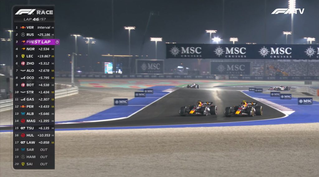A következő képen csak annyit látszódik, mintha a Katari Nagydíj 46. körében járva a két Red Bull egymással harcolna az első helyért. Valójában azonban az történt, hogy a versenyt végig vezető Max Verstappen a dohai futam hajrájában lekörözte saját csapattársát, Sergio Pérezt – ez a felvétel mindennél jobban szemlélteti, utóbbi milyen mélyre került a Red Bullnál: