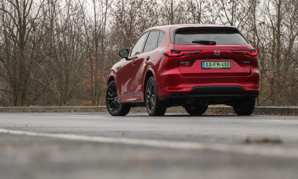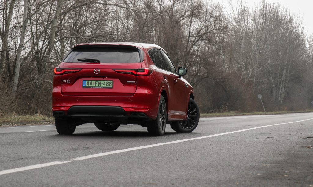 Drive by wire fékrendszere szépen elmossa a regeneratív fékezés és az üzemi fék közötti átmenetet, a kormányzása ugyan nem olyan beszédes, mint a többi Mazdában, de a pontosságával és a hosszmotoros anatómia balanszával így is élvezetesen vezethető, klasszul forduló autó a CX-60. Kanyarcsúcspont után kegyetlenül letaposott gázra a hátuljával indul meg, melynél kevés örömtelibb érzés van egy autóban.