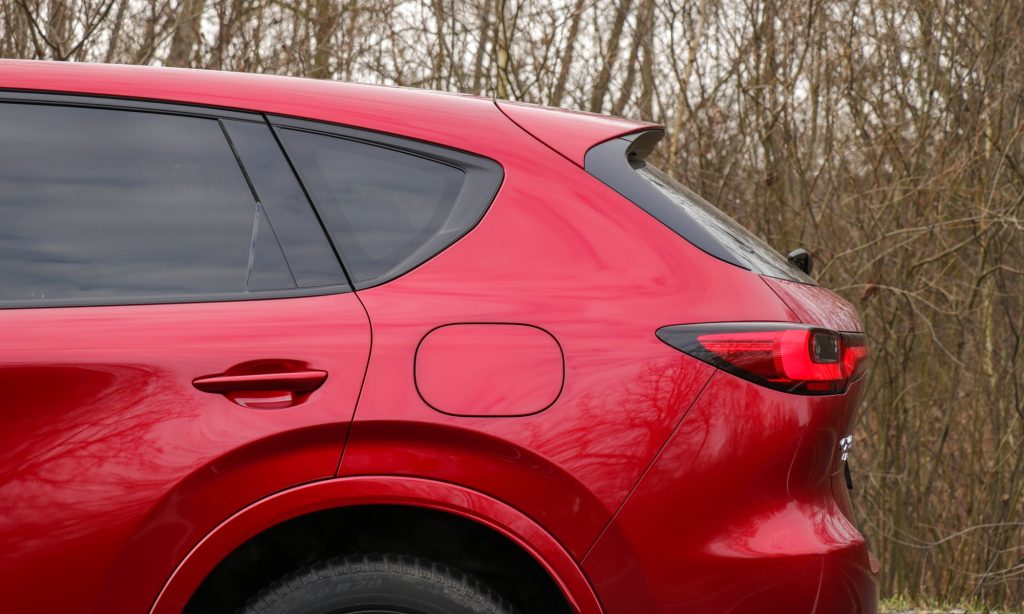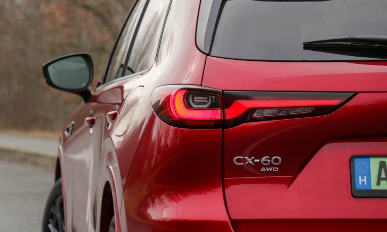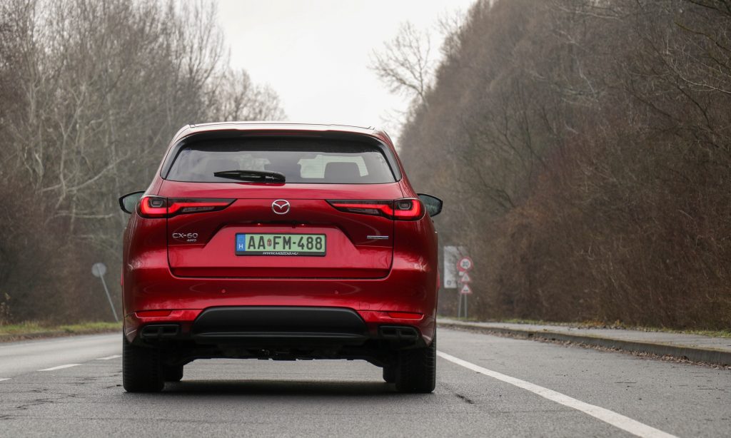 Radikalizált Kodo formanyelve egyszerre hozza a dinamizmust és a szabadidő-autók klasszikus bakancs formáját. Határozott élek szinte alig vannak rajta, csak finoman hullámzanak rajta a lemezek, amit nagyszerűen megmutat a gyönyörű mélybordó fényezés. Hátsó lámpáján is elég jellegzetes a menetfények vörös izzása az éjszakában, jól mutat a kis tetőszárny is az ablak felett. Annyira hangsúlyos a CX-60 mind a 4,7 métere, hogy még a 20 colos alufelnik is kicsinek tűnnek alatta, különösen fekete színben. Csillogó helyett füstös króm és fekete kiegészítőiről, mint a méhsejt mintás hűtőmaszk vagy az ablakkeretek könnyen felismerhető a sportosabb Homura felszereltség, melytől egyetlen lépésre van az elegáns Takumi.