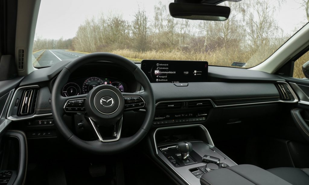 Kellemetlen lemezhangon csukódnak az ajtók, a kilincsek körül olyan kongás kíséretében, mintha tonhalkonzerv tetejéből hajtogatták volna. Az ilyen apróságokon érezni, hogy a Mazdának még tanulnia kell azt, amit a német prémiummárkák hibátlanul grammolnak ki. A legtöbb ponton azonban nagyon érezni a CX-60-ason, hogy a japánok komolyan gondolták, hogy benyitnak a másik kávéházba, ez pedig egy westernfilmesen erős belépő.