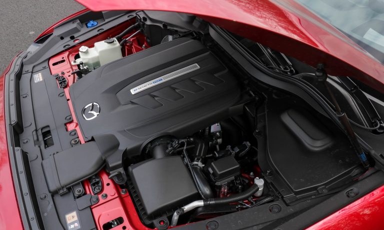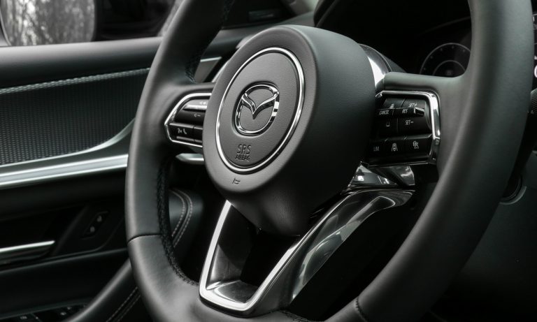 Még rá is játszik a nagyságára a hatalmas felületeivel és a gigantikus hűtőmaszkkal, ami annyira az agresszív arc szélére szorítja a LED-es fényszórókat, hogy a nappali menetfények dühösen átszúrják a keretét. Akkora Mazda logó díszeleg az oldalról szinte függőleges vonalú orrán, hogy ennél már csak háromágú csillag szokott büszkébben a levegőnek feszülni.