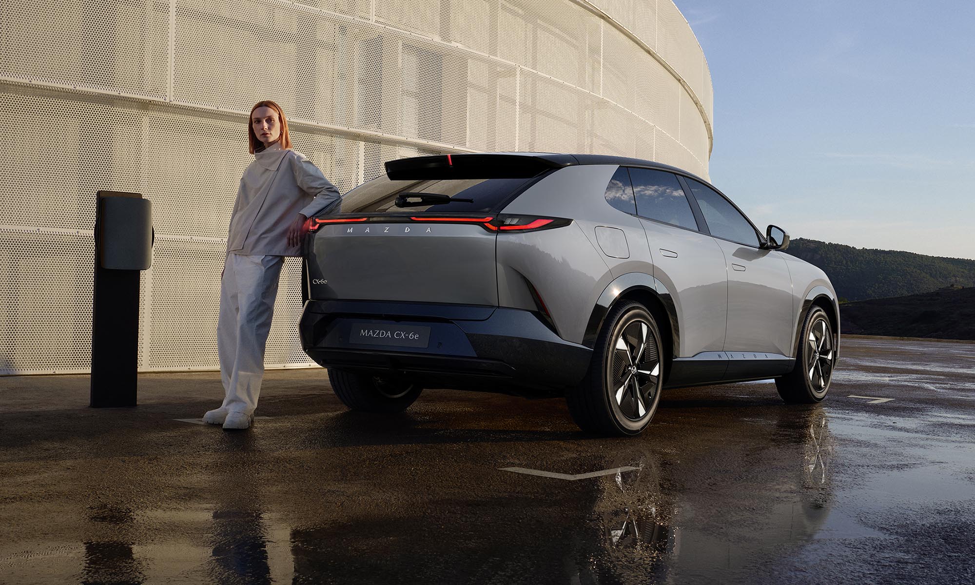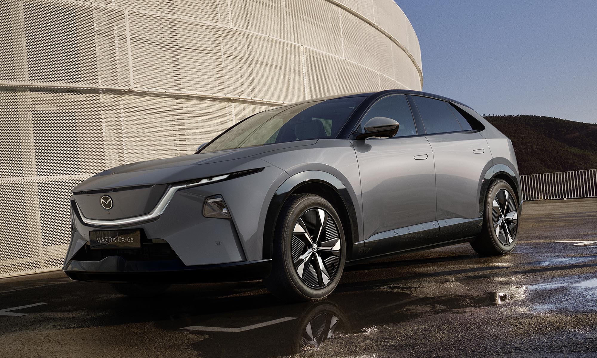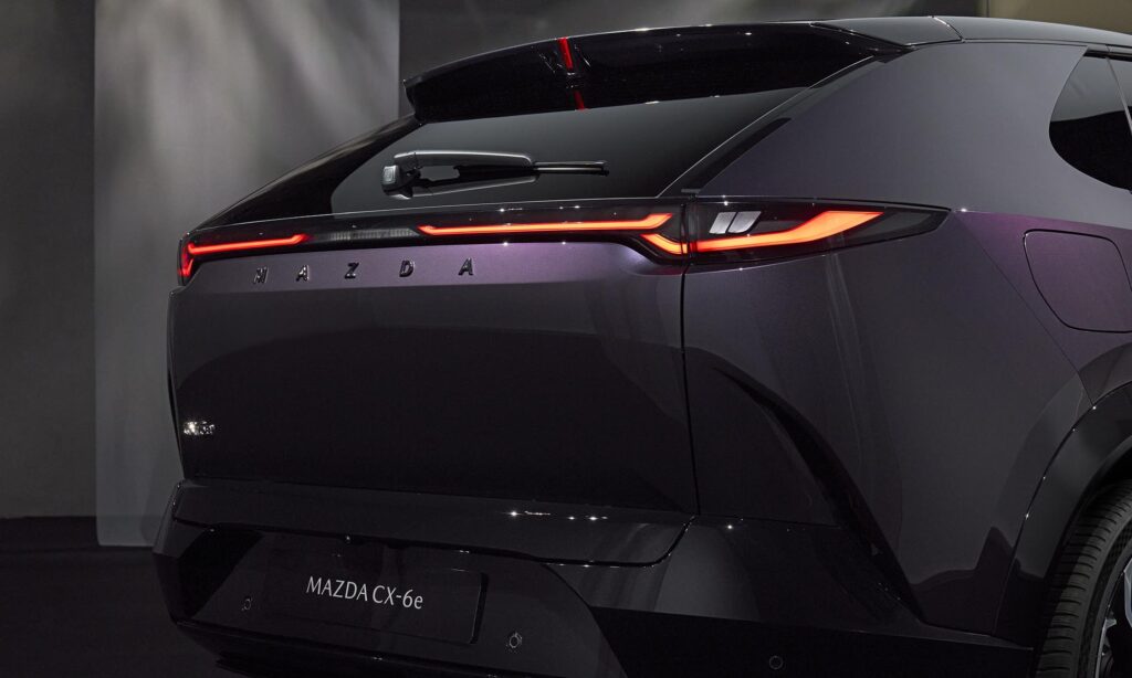 Az újdonság teljesen egyedi, a márkára jellemzően gyönyörű karosszériát kapott, a határozottan izmos helyett áramvonalasan lekerekített idomokkal. A Mazda6e-nél látott, az emblémával együtt megvilágított hűtőmaszk itt is megvan, az elegáns hátsó lámpák pedig még szélesebbnek láttatják az autót.