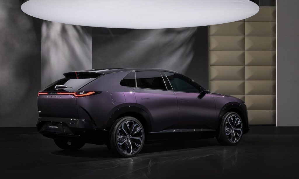 A képeken talán nem látszik, de a neve elárulja, hogy az új CX-6e nem a CX-5 elektromos megfelelője, sokkal inkább a CX-60-hoz áll közelebb, ahhoz a hátsókerék-hajtású, hathengeres motorral is kínált modellhez, ami az utóbbi években elismerést hozott a Mazdához. Meglepő lehet, de a 4,85 méter hosszú, 1,94 méter széles és 1,62 méter magas CX-6e