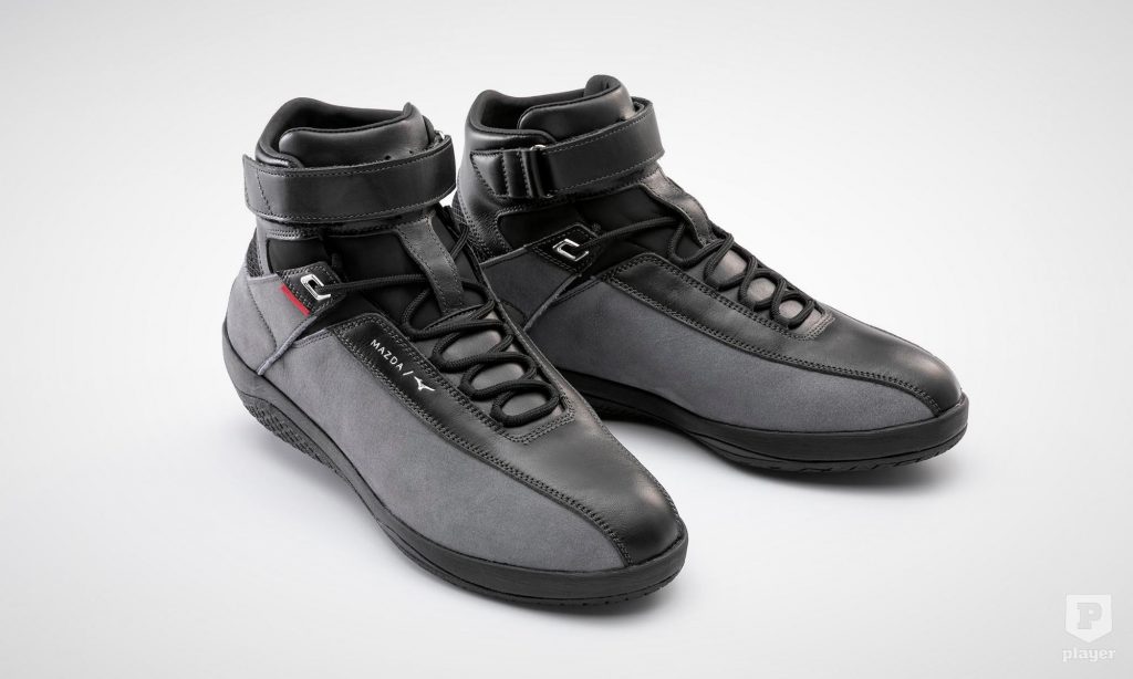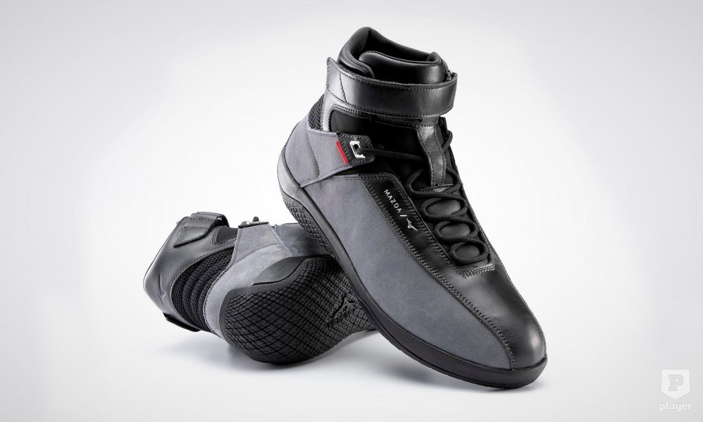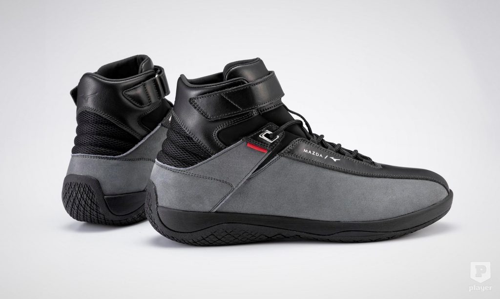 a versenyzőcipőkkel ellentétben nem túl vékony a talpa, hanem egészséges egyensúlyban tart járás közben is. A mutatós lábbelihez szürke nubuk műbőrt és fekete marhabőrt használtak fel, a magasszárú cipő színvilága is a Mazda stílusára emlékeztet.
