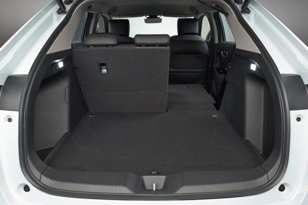 A térkínálatról a fotók alapján még nem tudunk véleményt mondani, mindenesetre a kocsi beltere ugyanolyan tisztának és rendezettnek tűnik, mint a Jazzé. Az üléssorok közti tér 3,5 centit nőtt, a hátsó üléstámlák két fokkal döntöttebben fekszenek: családiasabb autó lett a HR-V. Jópofa újdonság a műszerfalon a kis tekerentyűkkel ellátott két oldalsó légrostély, amelyek gyorsan átkapcsolhatók koncentrált fújásról finoman oszlatott szellőztetésre. A felhajtható hátsó ülőlap, a Honda nagy varázslata az új HR-V-ben is megmaradt, a csomagtartóban pedig, ha teljesen lehatjuk az üléstámlákat, állítólag elfér két darab 26-os hegyibringa is.