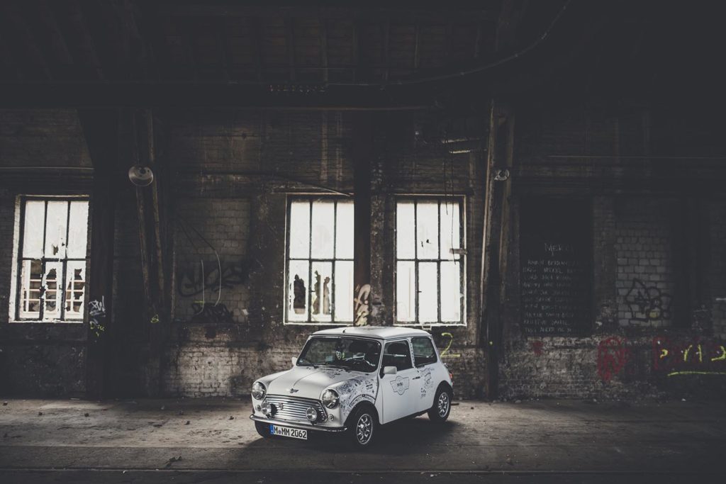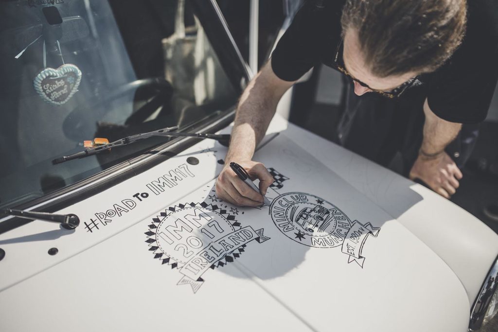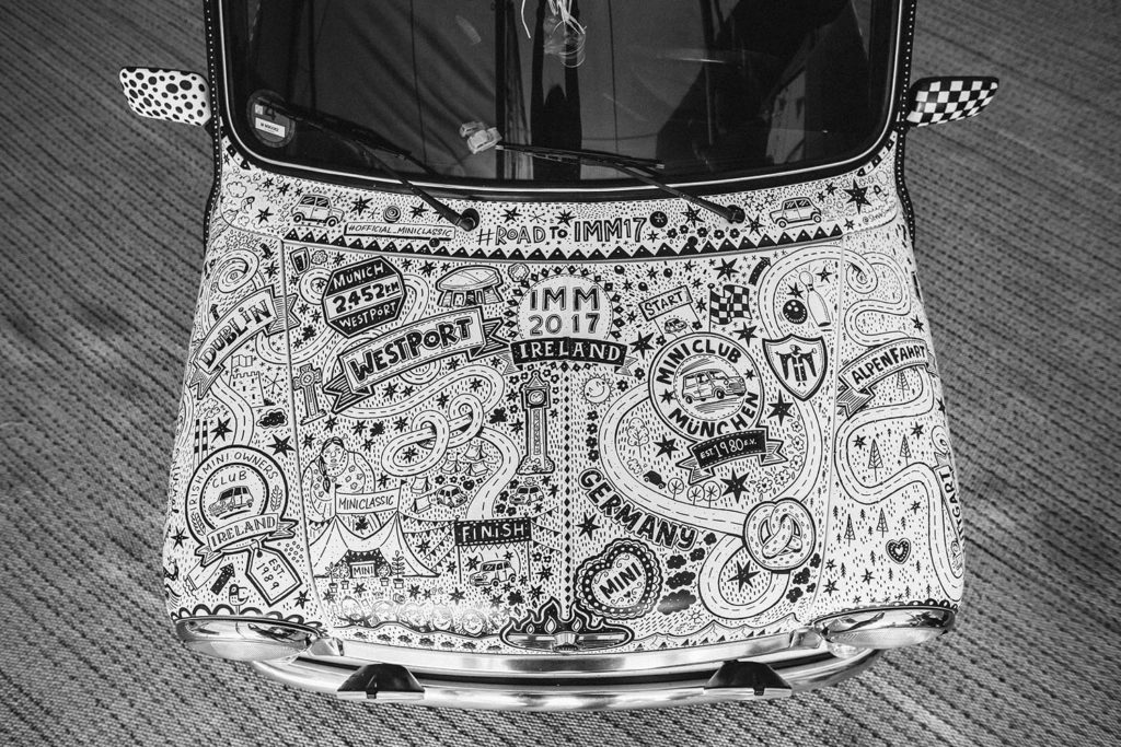 A nemzetközi Mini-találkozóra indult Münchenből ez a klasszikus példány, és mivel az idei meeting Írországban volt, szép kis túra kerekedett belőle. 6 nap alatt 2500 kilométert tettek meg, az útinaplót pedig a fehér karosszériára rajzolták, ami a végére tele lett élményekkel.