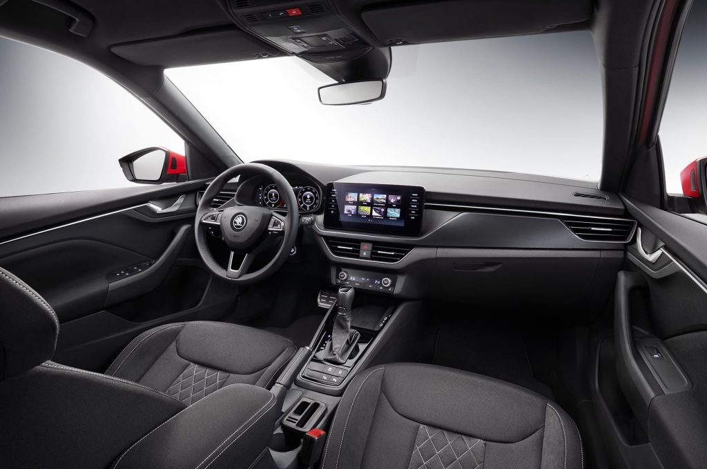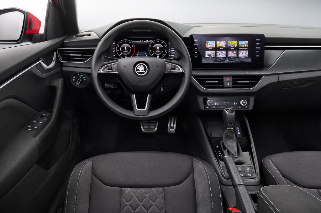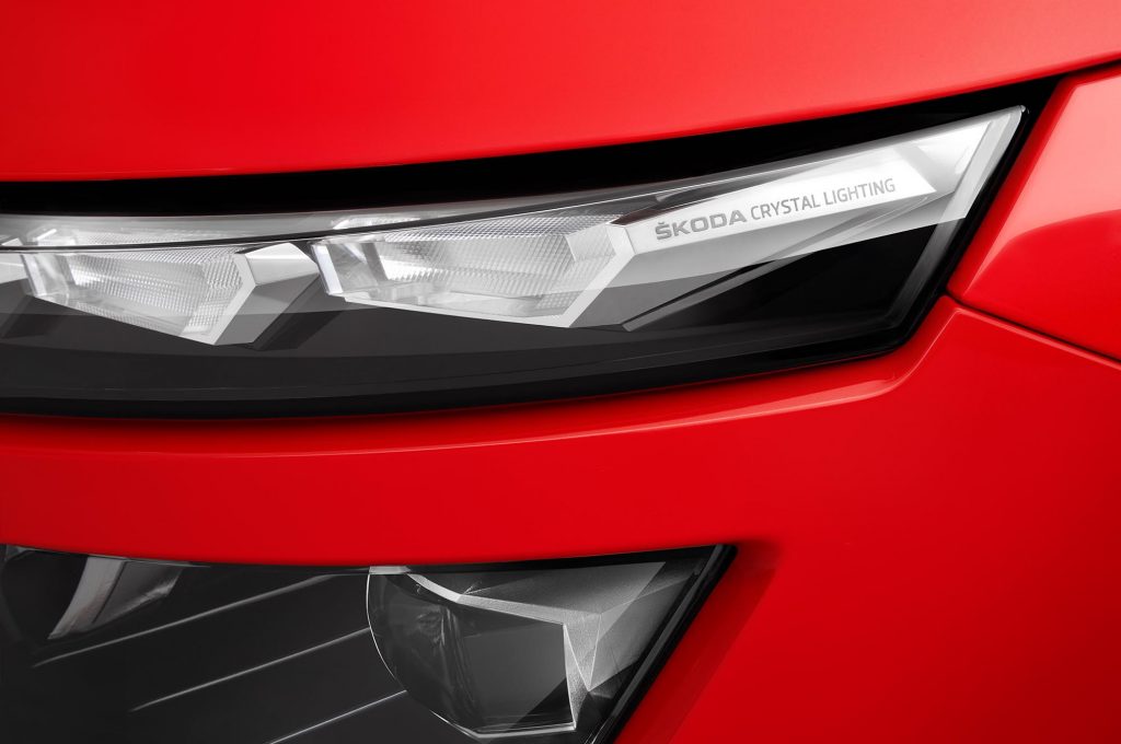 Megvan rajta a cseh márka tipikus hűtőmaszkja, a fényszórókat pedig a kategória divatja szerint két részre osztották, a felső fénycsíkban kap helyet a menetfény és az irányjelző. A hátsó lámpákat a szintén újonnan bemutatott Scala stílusában rajzolták meg.