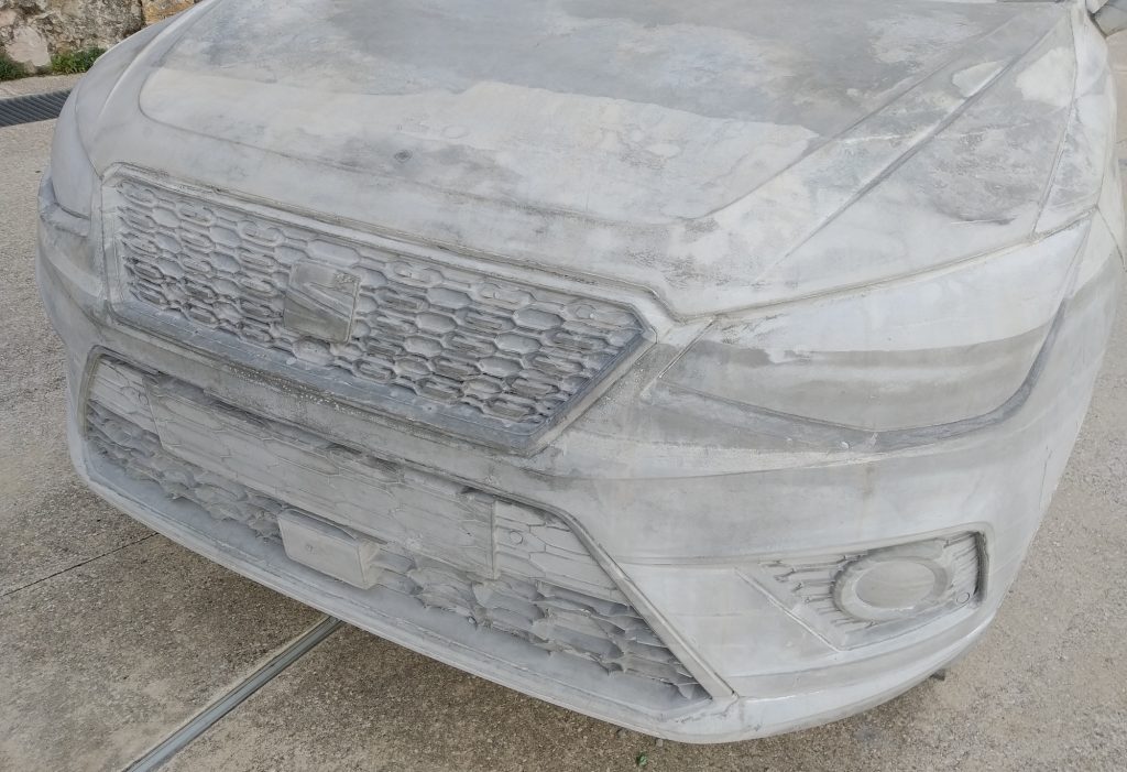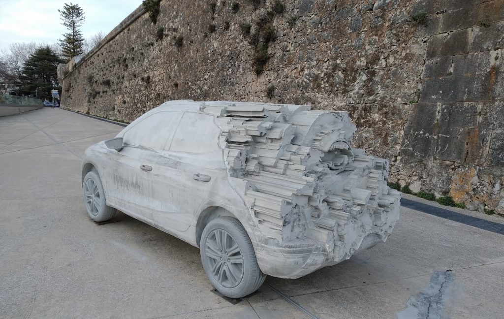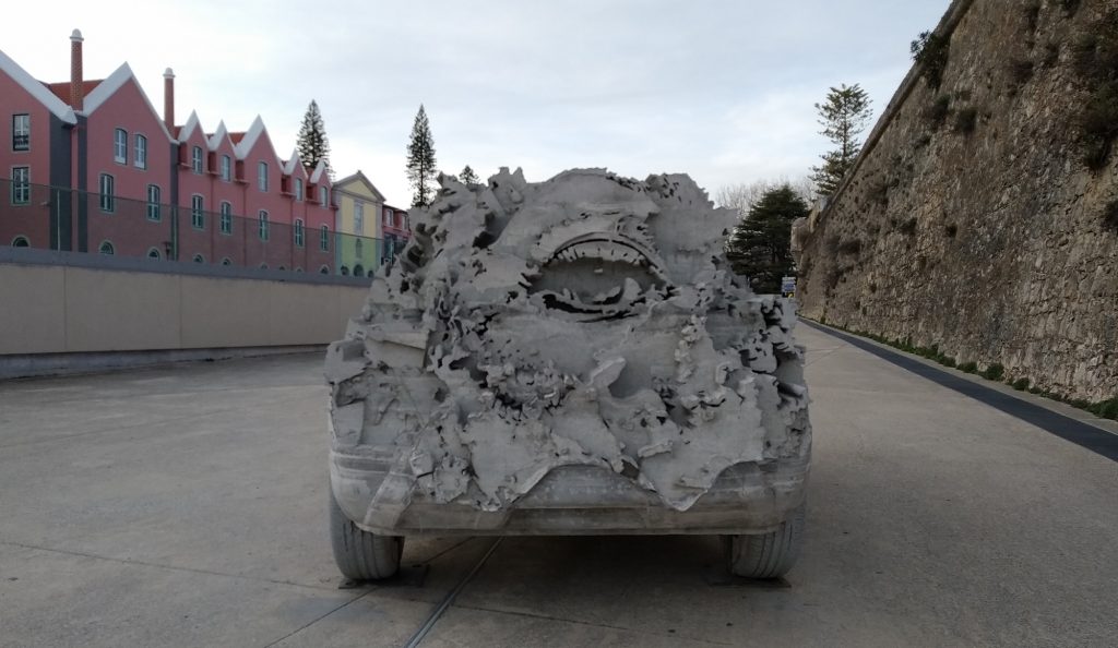 Csak azért nem tömör beton, mert némi acél, szilikon és üveggyapot is került bele. A kocsi Alexandre Farto portugál street art dizájner alkotása, egy szabadtéri szobor, amellyel
