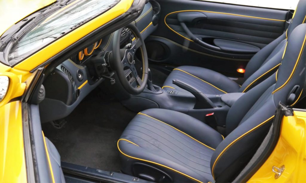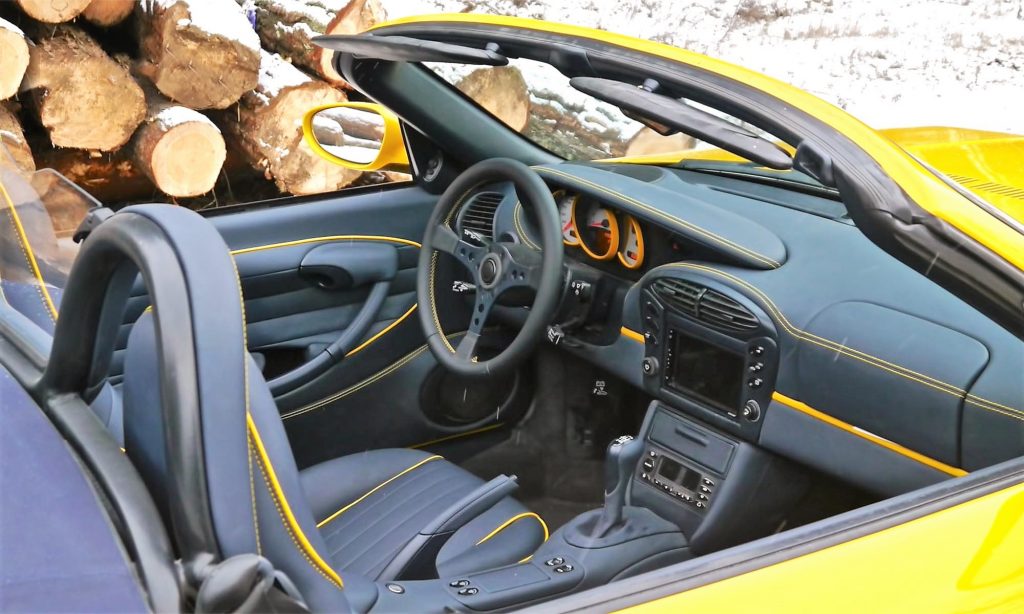 A belső már elárulja, hogy ez igazából egy Boxster, de a kárpit varrása így is a kanárisárga fényezéshez illik. A fehér lemezfelni is tökéletes választás volt hozzá.