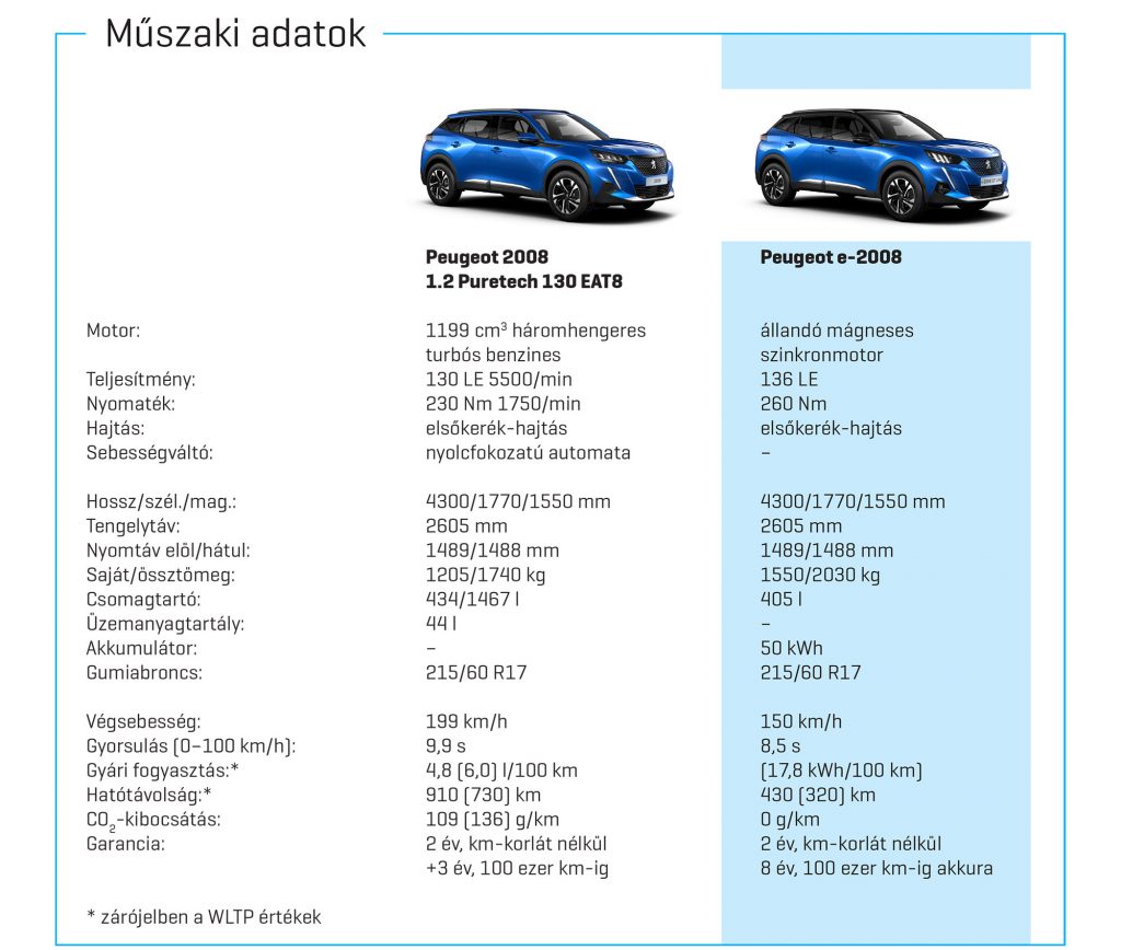 A PSA-csoport, úgy tűnik, jelenleg az utóbbi megoldást preferálja. A Peugeot 208-Opel Corsa ikrek és a DS 3 után a tavaly bemutatott 2008-as crossover szintén kapható benzines, dízel és elektromos hajtással is. A 136 lóerős elektromos autó legközelebbi benzines vetélytársa az automata váltós, 1,2 literes, 130 lóerős háromhengeres, turbós benzines változat. Ezekből kértünk el egyet-egyet, hogy összevethessük a klasszikus és az új technológiai előnyeit és hátrányait a két szemre egyforma autóban: