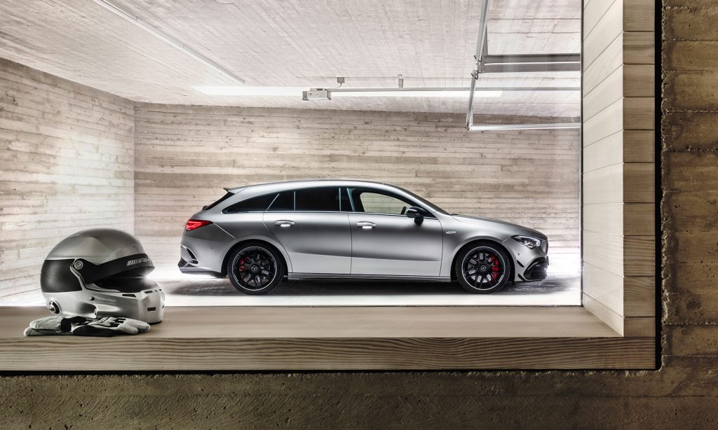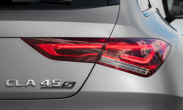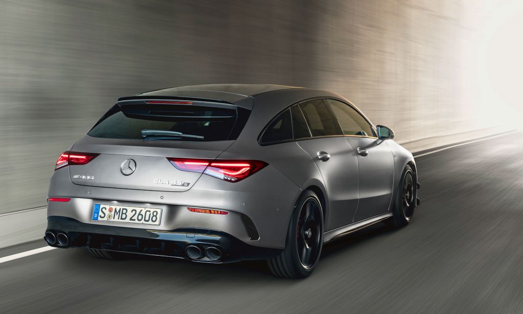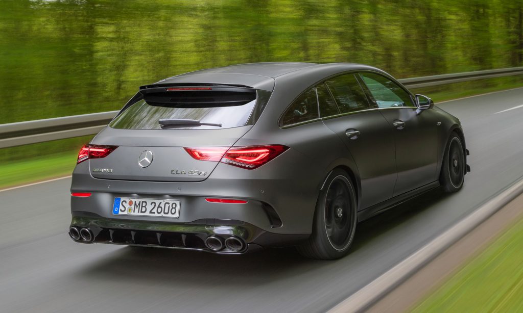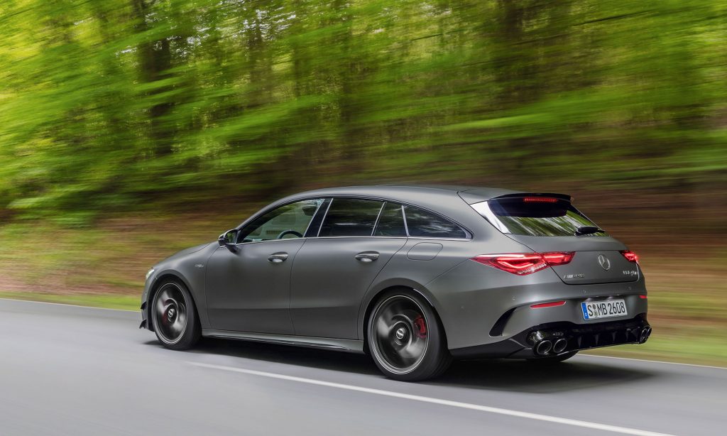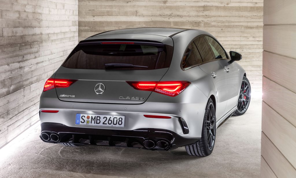 A lépcsőshátú CLA mintájára a kupés vonalú kombi is rögtön kétféle kivitelben érkezik. A CLA 45-ben a kétliteres motor 387 lóerőre és 480 Nm-re képes, néhány lóerővel már ez is több az elődjénél,