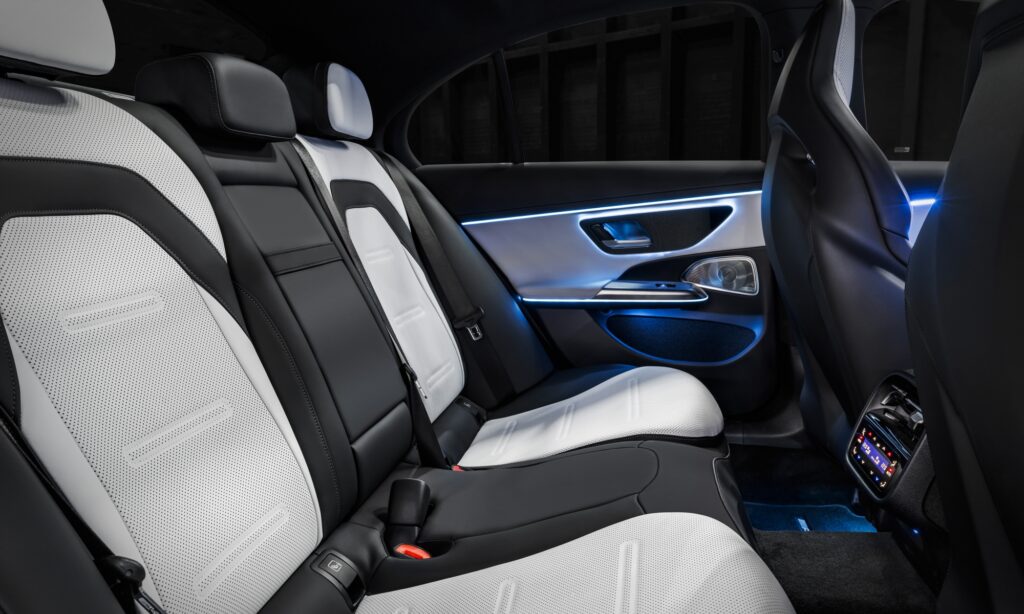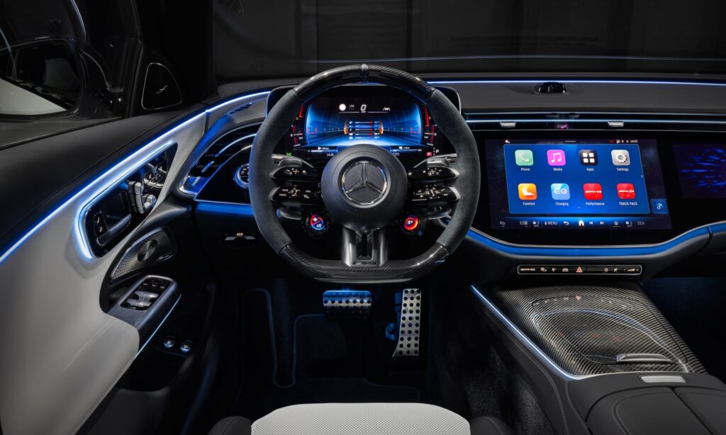Akár három műszerfali kijelzővel és az utastér felé néző kamerával is kérhető (MBUX Superscreen) a Mercedes-AMG E 53, amivel így töltés közben lehet lezavarni az online meetinget vagy netes tartalmakat fogyasztani, esetleg élvezni a relaxáló programok és a hangulatvilágítás játékát. Egyetlen kompromisszum, hogy a kagylóüléshez nem jár masszázs és kevesebb az állítási lehetőség, de a pályanapokon a feszes tartással értékes másodperceket lehet nyerni vele.