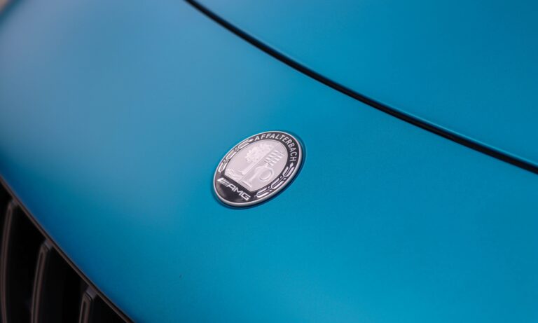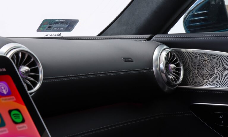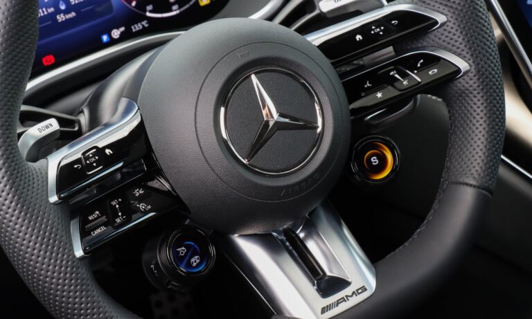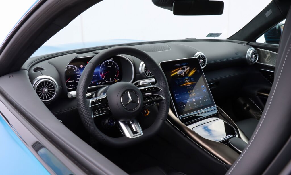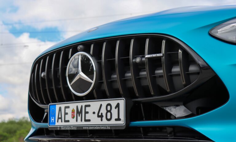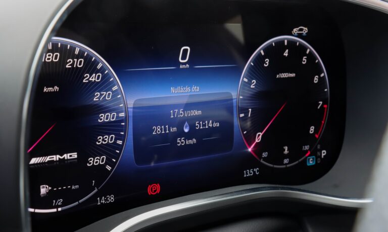 Mélyen ülök a feszesen tartó kagylóülésben, közel az autó tömegközéppontjához, a vállam vonalában kezdődik az ablak, a szélvédő pedig olyan széles és vékony, mintha Quentin Tarantino szemével nézném a világot. Mellettem hegygerincként magasodik a könyöklő, előttem pedig ott a vaskos AMG sportkormány, melynek dupla küllőin érintőgombok sorakoznak és színes kis ikonok pixelekből. Árnyékoló alatt van a digitális óracsoport 12,3 colos kijelzője, hogy mindig látható legyen. Sportosabb, letisztultabb és térképes nézete is van, de én maradtam a tradicionális mutatós óráknál. Messze nincs meg benne az a megingathatatlan örökkévalóságnak tervezettség, mint egy W140-esben, de a hangulatában ott van az a fűszer, a finom bőr tömény illata, a kellemes tapintású anyagok, amitől klasszikus Mercedesnek érződik.