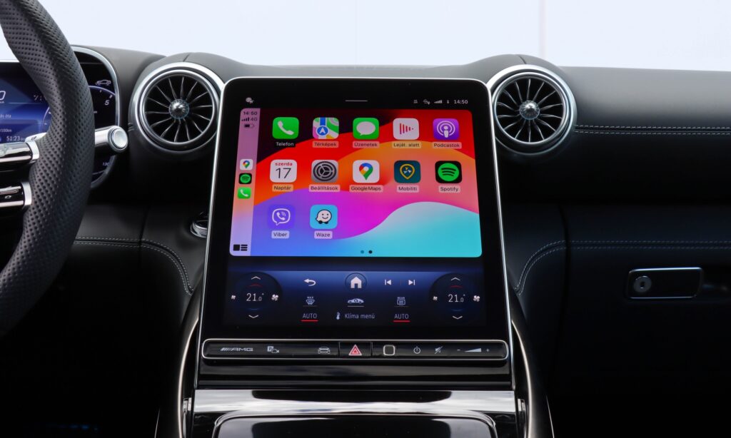 Nagyszerűek a turbina alakú légbeömlők és a Burmester hifi lézermart hangszórórácsai, de a középkonzolt a 11 colos, álló formátumú érintőkijelző uralja, melyen a remek MBUX fedélzeti rendszer fut. A tűéles képű és igényes grafikájú képernyő alján a szellőzés funkciói vannak, felette pedig a menü vagy az Apple CarPlay. Jól működik a beszédvezérlés és logikus a menüje, de a GT-ben sokkal érdekesebbek az AMG specifikus funkciók, mint az IWC stopper, a gombnyomásra vadítható hajtás vagy a hátsó gumik kegyetlen gyilkosa, a drift mód.
