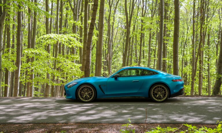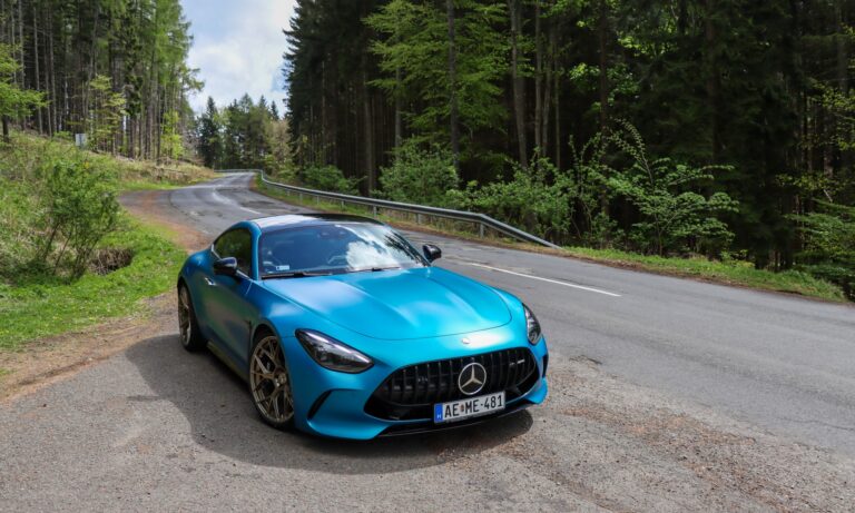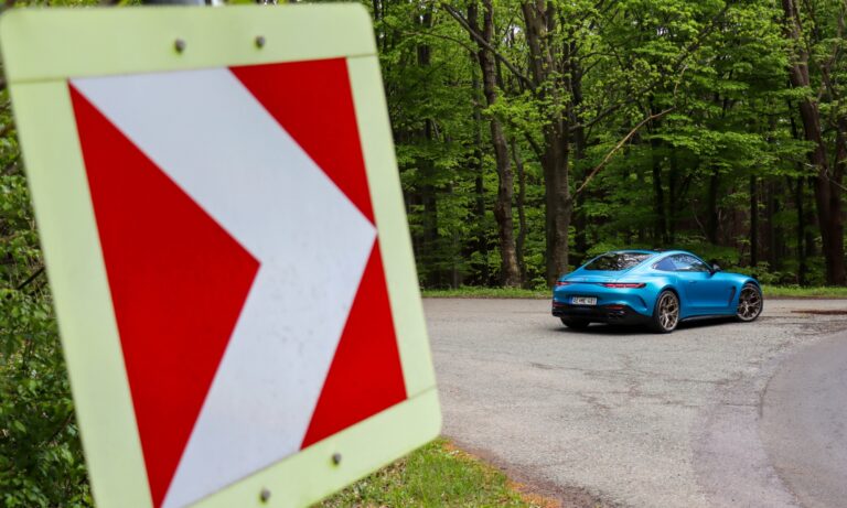 Izzó narancssárgára festette az ég alját a naplemente, és magasan a fák lombjai felett olyan gyönyörű átmenettel fordul aranyba, mintha Monet festette volna ma a Dunakanyart. Ezen a látványon nincsenek ecsetvonások, sem szignó a sarokban, a távolból viszont ordas üvöltés tölti meg a völgyet. Zeng a nyolc henger és süvít a két turbó, messziről hallani, hogy a Mercedes-AMG GT 63 4matic+ Coupé garázdálkodik a szerpentinen.