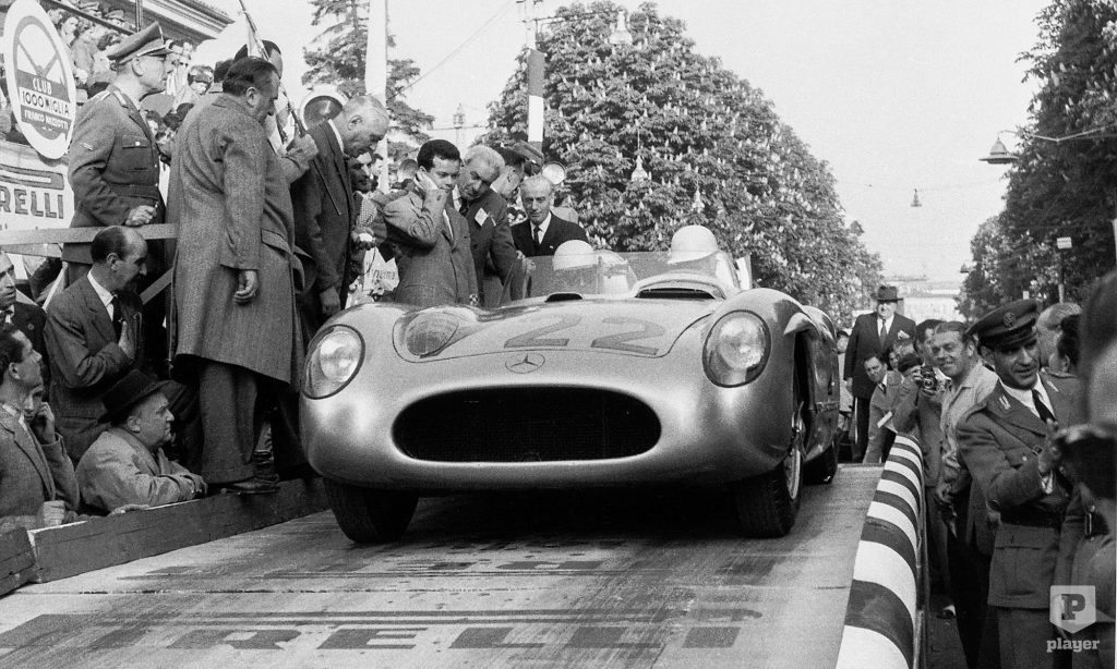 A Mercedes a sportautók között is uralta a terepet, és Stirling Moss minden idők egyik leghíresebb győzelmét aratta 1955-ben, amikor 160 km/órás átlagsebességgel nyerte meg a Mille Migliát egy 300 SLR-rel csapattársa, Fangio előtt. A Mercedes két autója egy hónappal később a 24 órás Le Mans-i futamot is vezette, amikor halálos tömegbaleset történt, és ennek következtében a Mercedes három évtizedre kivonult a motorsportból.