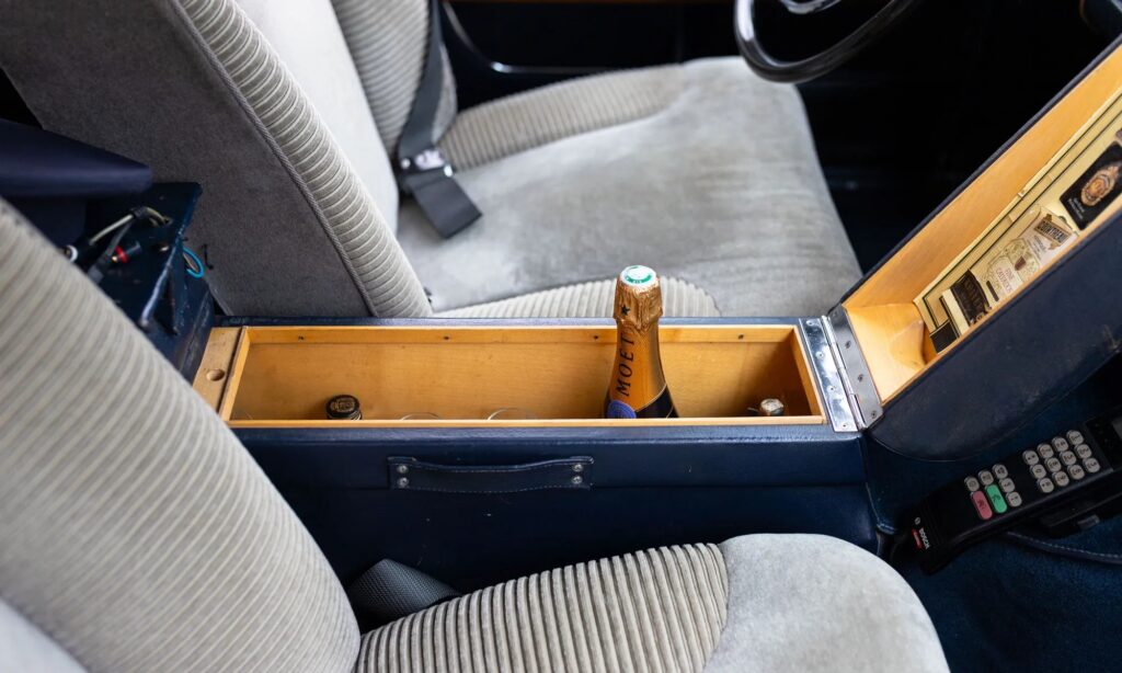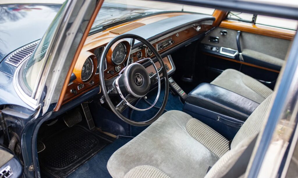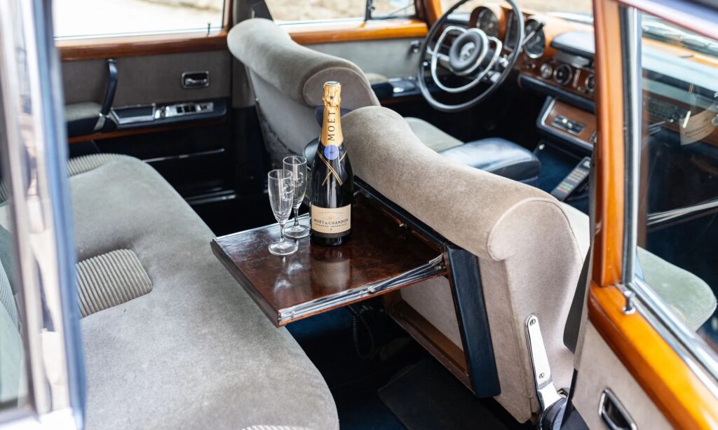 Kétféle tengelytávval készültek a W100-as Mercedesek, melyek közül ez a 3,2 méteres változat számít a szerényebb kivitelnek. Chandon de Briailles autója kék fényezésű, az utasterét pedig puha tapintású velúrral kárpitozták. Az opciós tételek között szerepel a Becker Grand Prix rádió, a klíma és az elmaradhatatlan pezsgőhűtő is. Az első ülések háttámlájából kihajtható fa asztalkán ideális helye van a Moët et Chandon palacknak és néhány pohárnak.