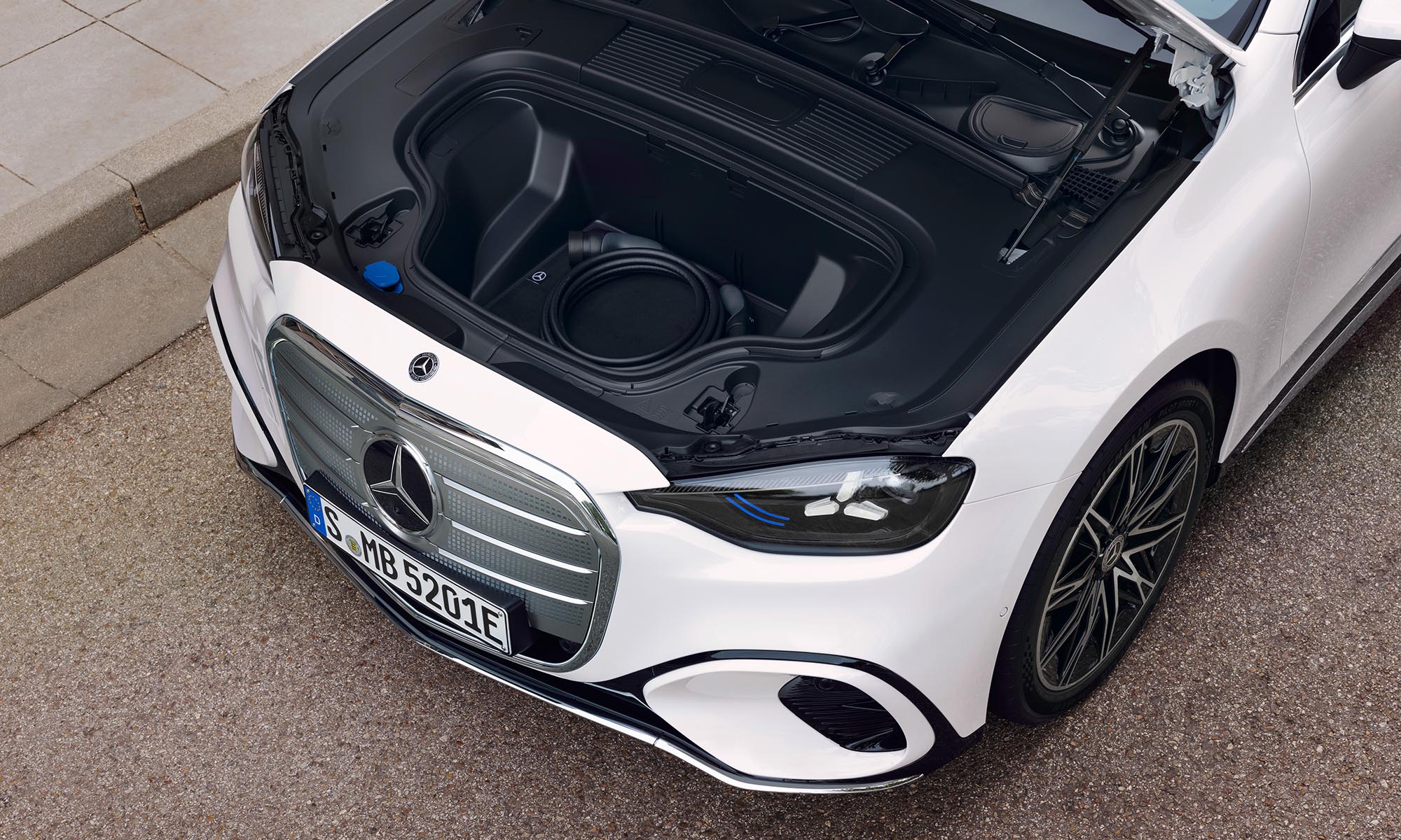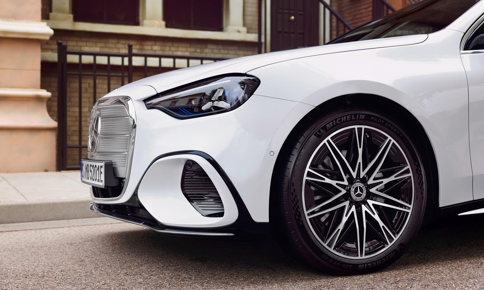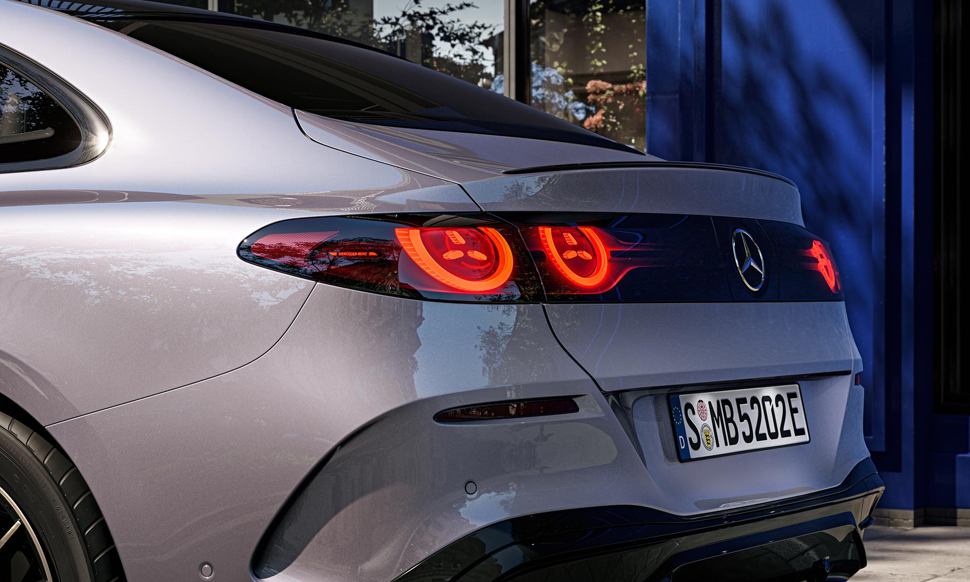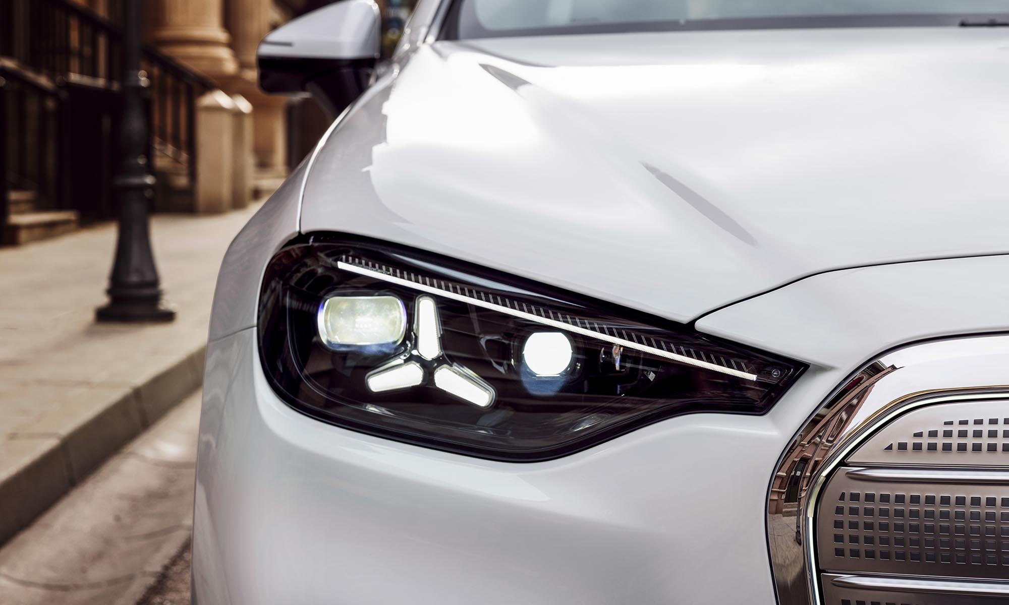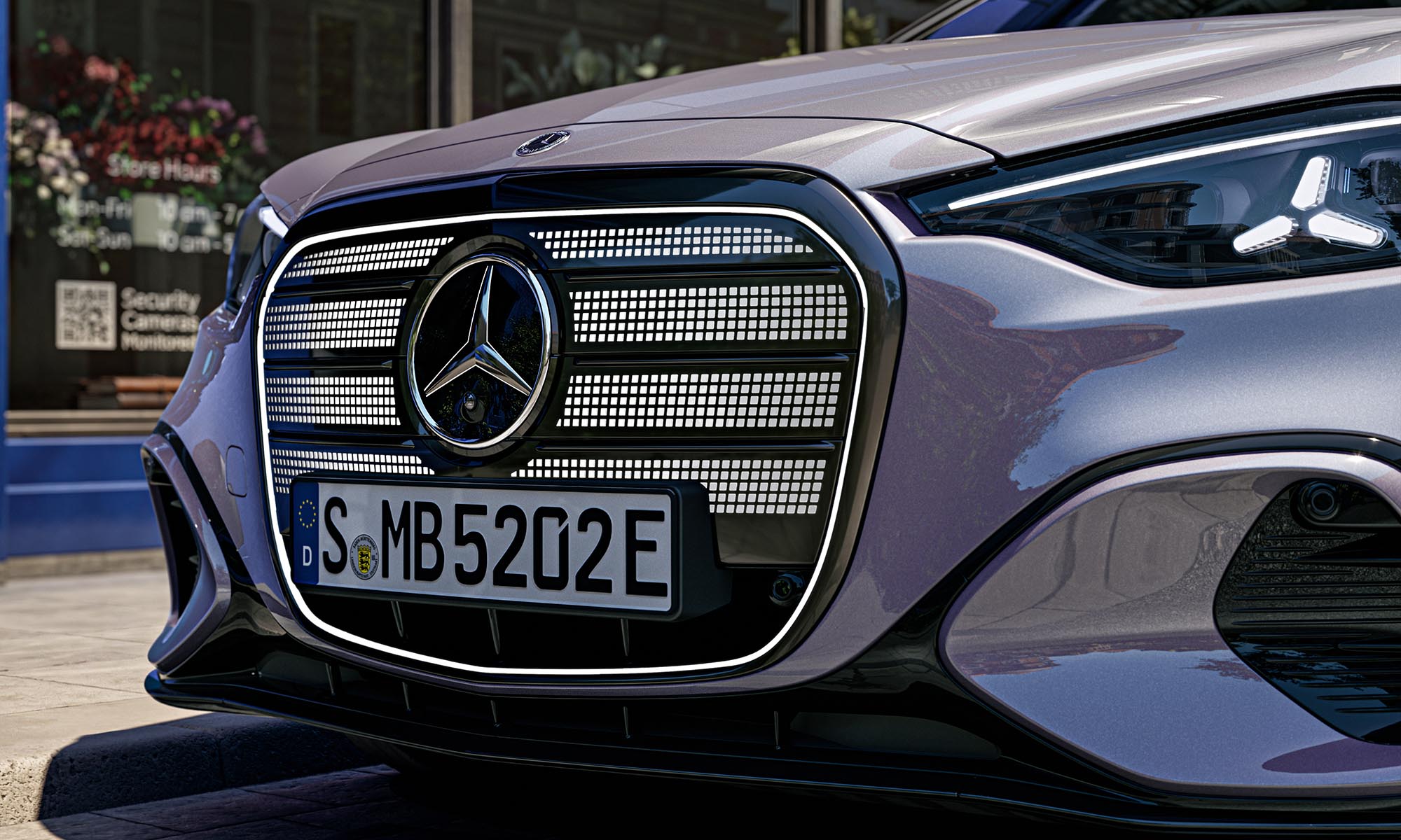 Az arcának éke a klasszikusokat idéző, függőleges hűtőmaszk, aminek megvilágított keretében 1050 apró fényforrás kapott helyet, és ezek nyitáskor vagy töltéskor látványos animációval üdvözölnek. A nappali menetfények és a hátsó lámpák pedig a háromágú csillag motívumában világítanak.