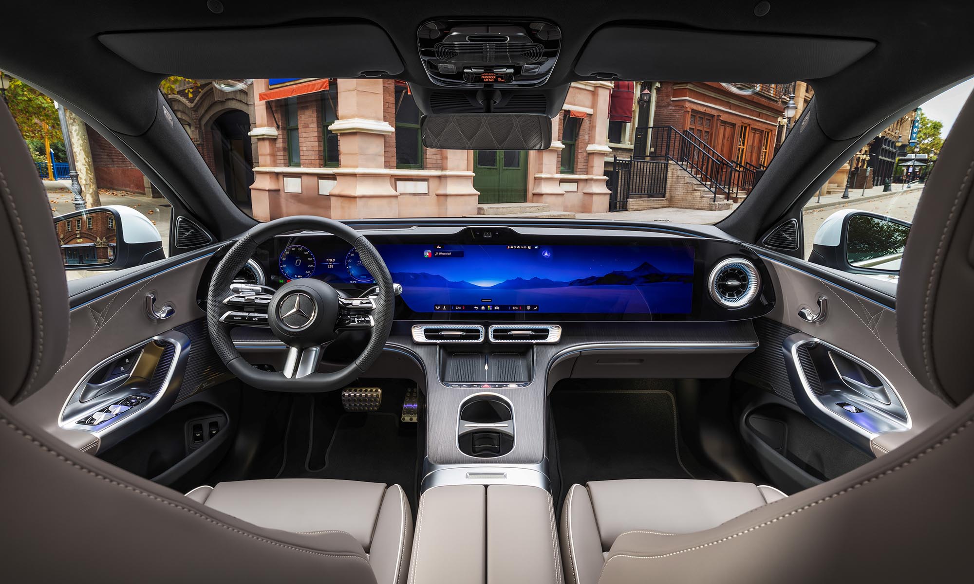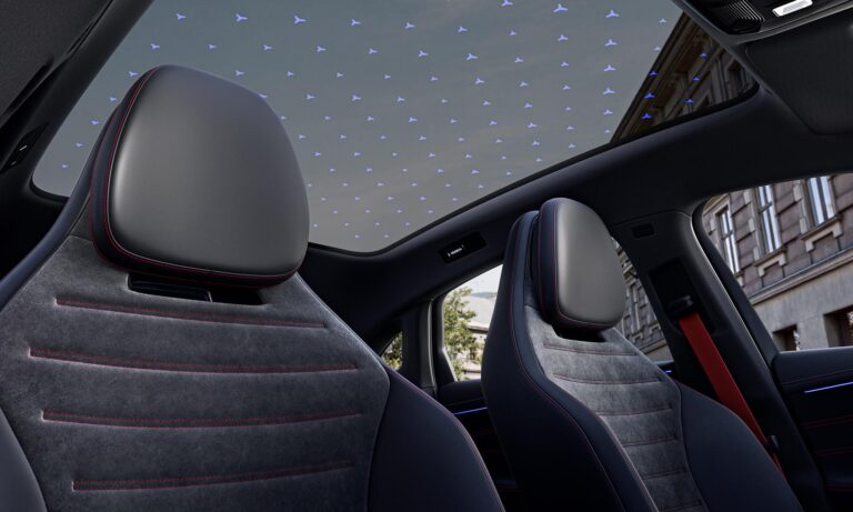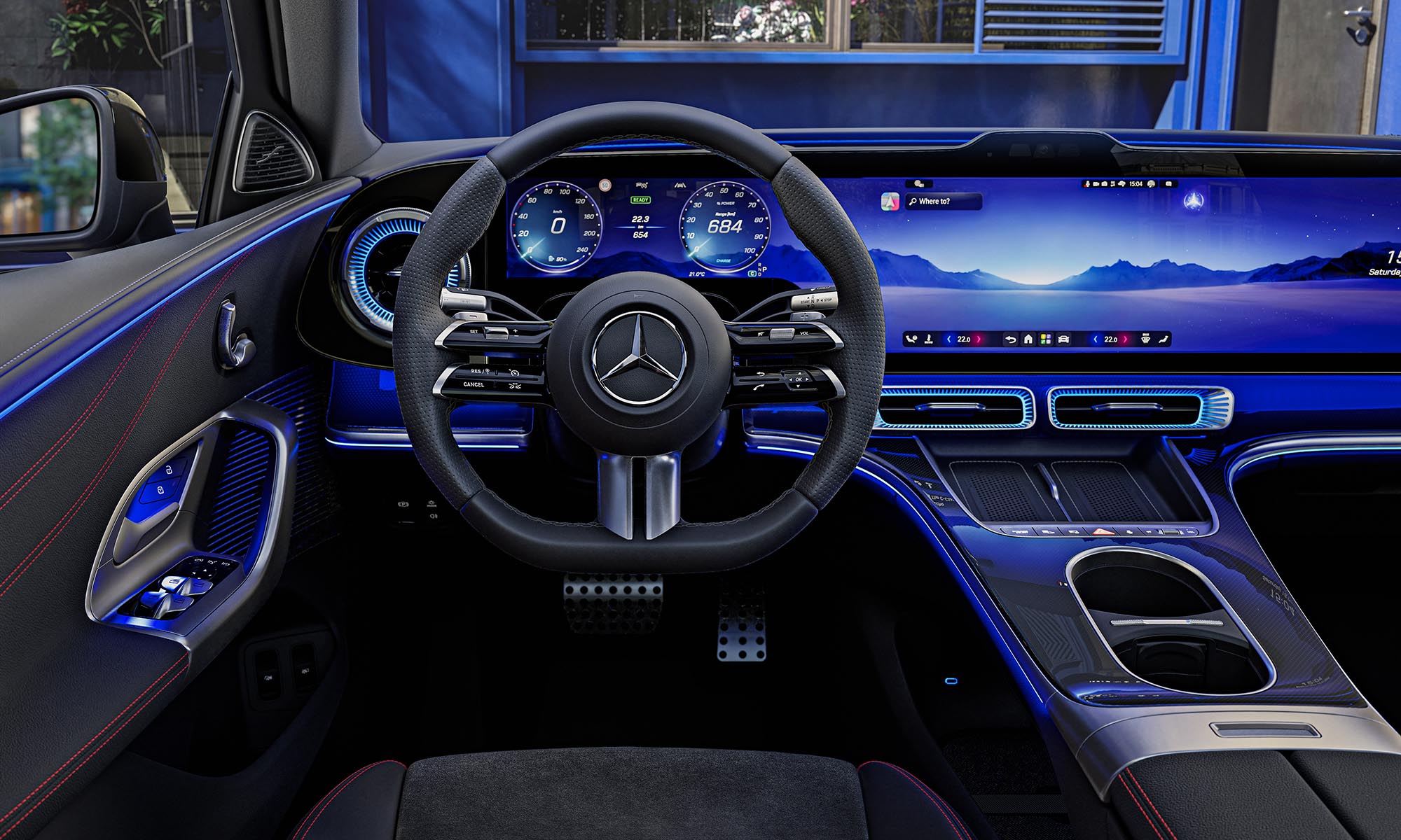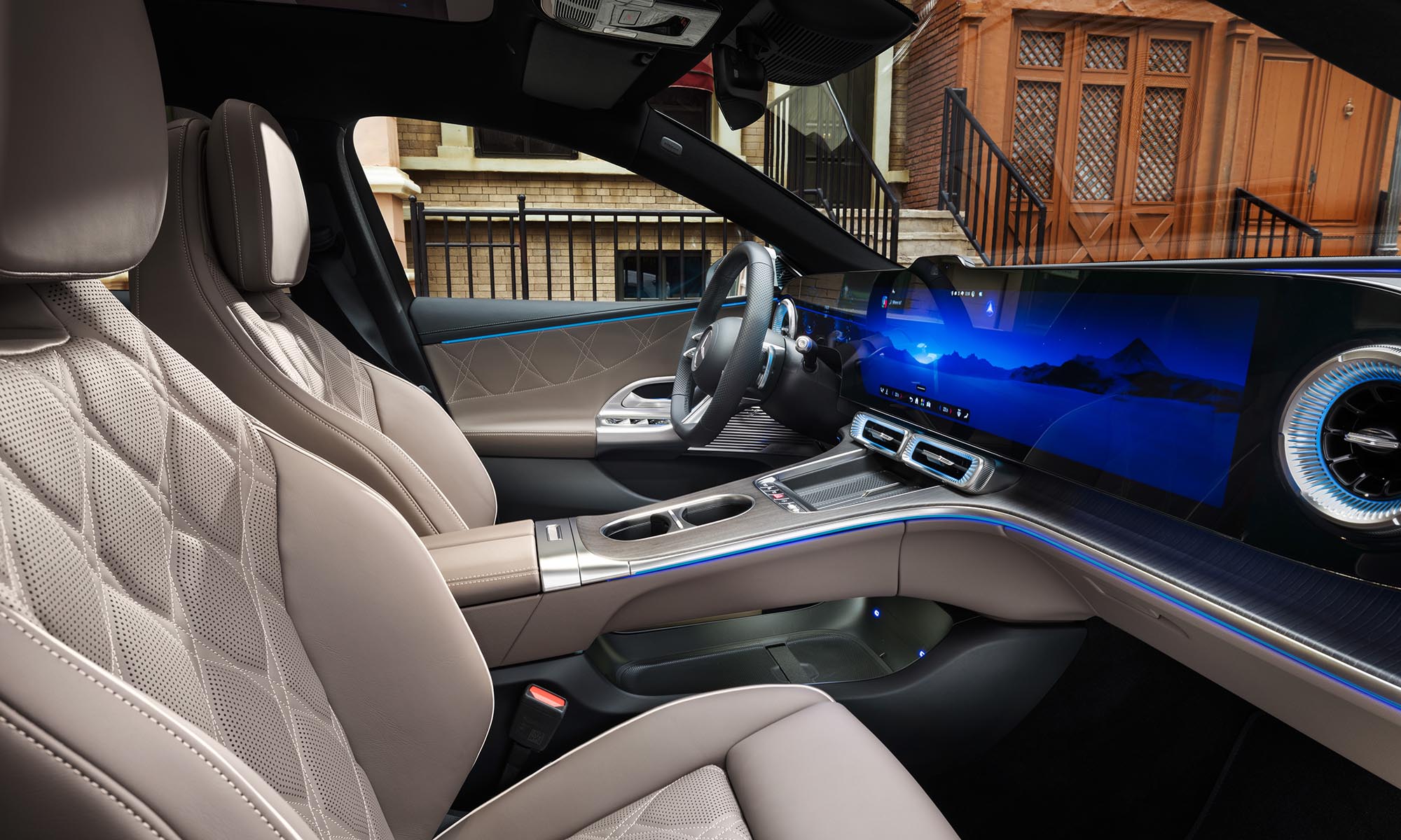 ami nem több képernyőből áll össze, hanem tényleg ekkora egybefüggő digitális felület. Nem kevésbé látványos a középső felszereltség műszerfala sem, hiszen a dizájn ugyanaz, de egy 10,3 colos műszeregység és két 14 colos érintőképernyő adja össze, a belépőmodellnél az utas oldalán képernyő helyett megvilágított dekorációval. Szintén látványos a panorámatetőbe integrált 162 világító csillag, amelynek színe a hangulatvilágításhoz igazodik.