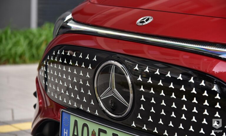 Menet közben ezek mindegyike világít, amikor viszont nyitjuk-zárjuk az autót, mini fényshow-val szórakoztatnak, kiemelve a központi csillagot, aminek a befoglaló karikája viszont sötét marad, mert Európában tilos középre is nagy világító kört helyezni, gondolom azért, nehogy valaki összetévessze a CLA-t egy közúton érkező Mercedes mozdonnyal. Még fényesebbek a LED-csíkkal összekötött fényszórókban lévő, irányjelzőként is funkcionáló menetfénycsillagok, ezekkel és a motorháztetőn lévő kis plakettel együtt, ha jól számolom, 146 csillag van összesen az autó orrán, ebből 145 világít. Ez tényleg sok, de egész könnyen megszokható.
