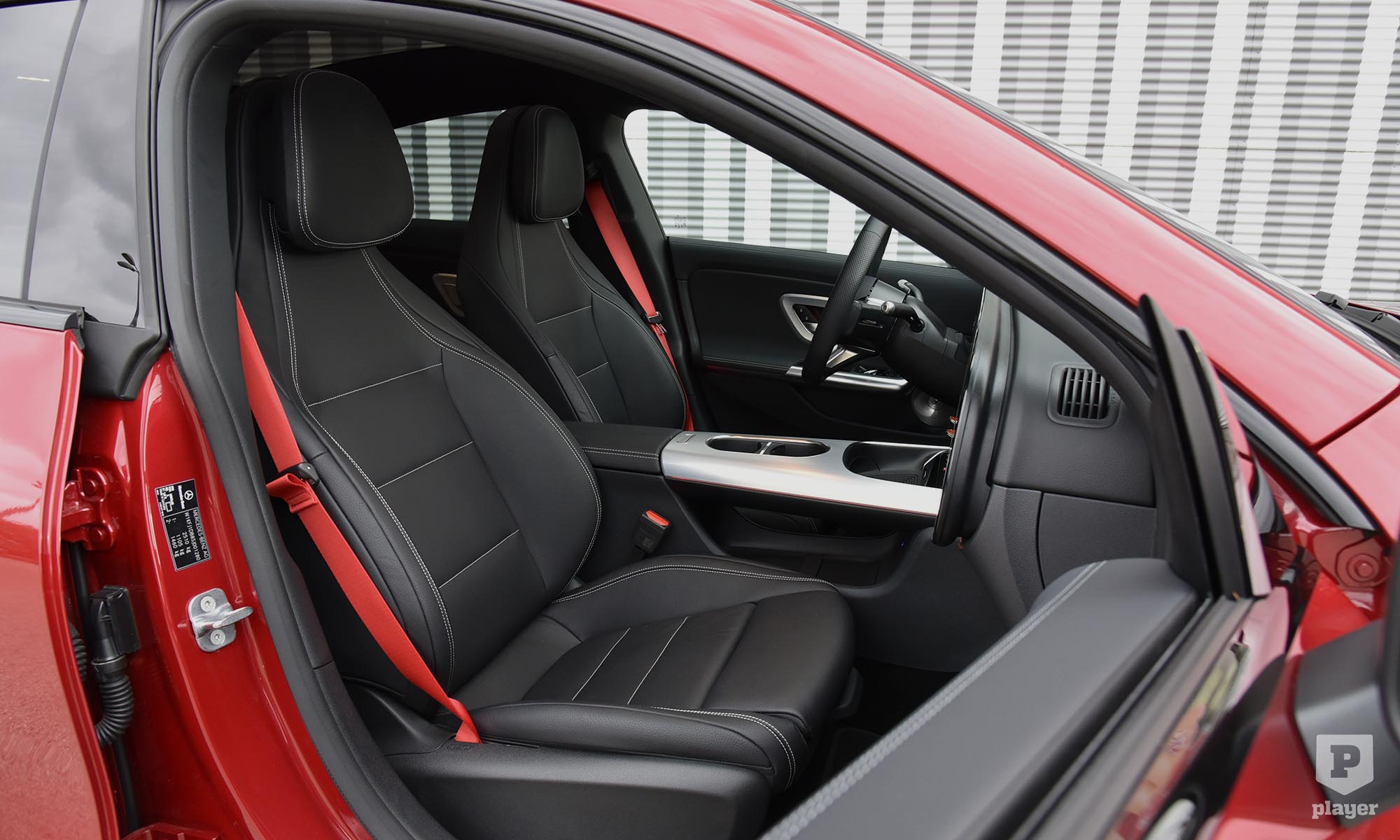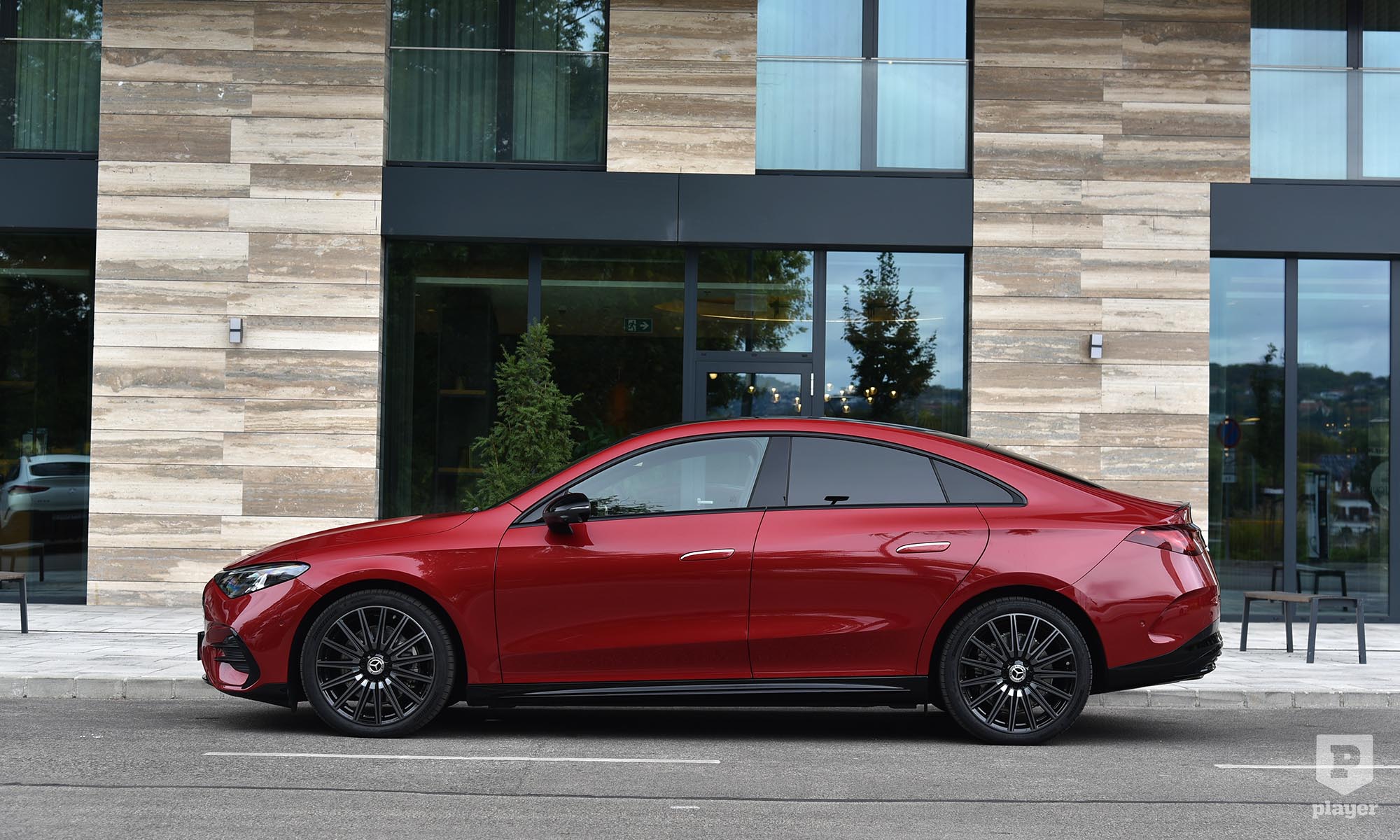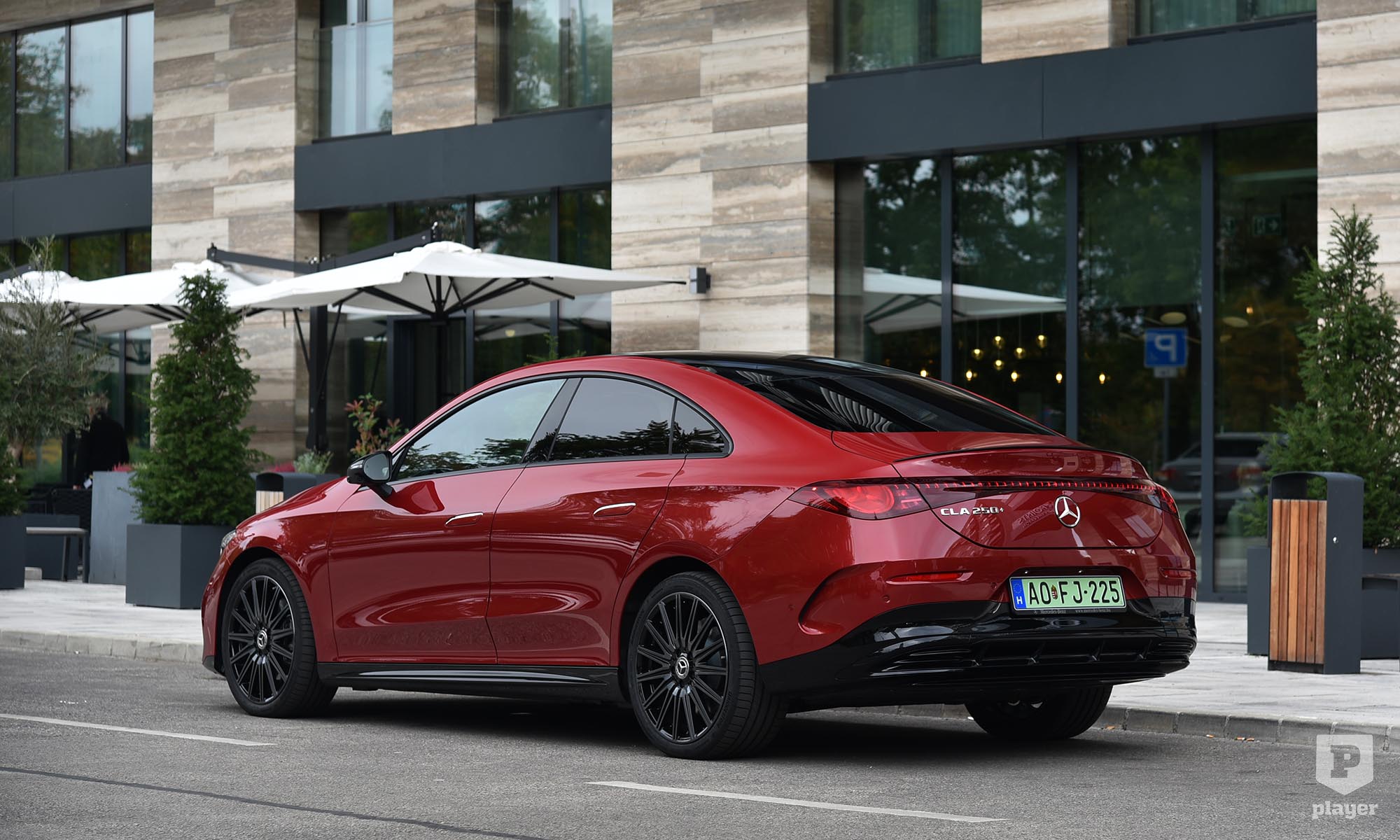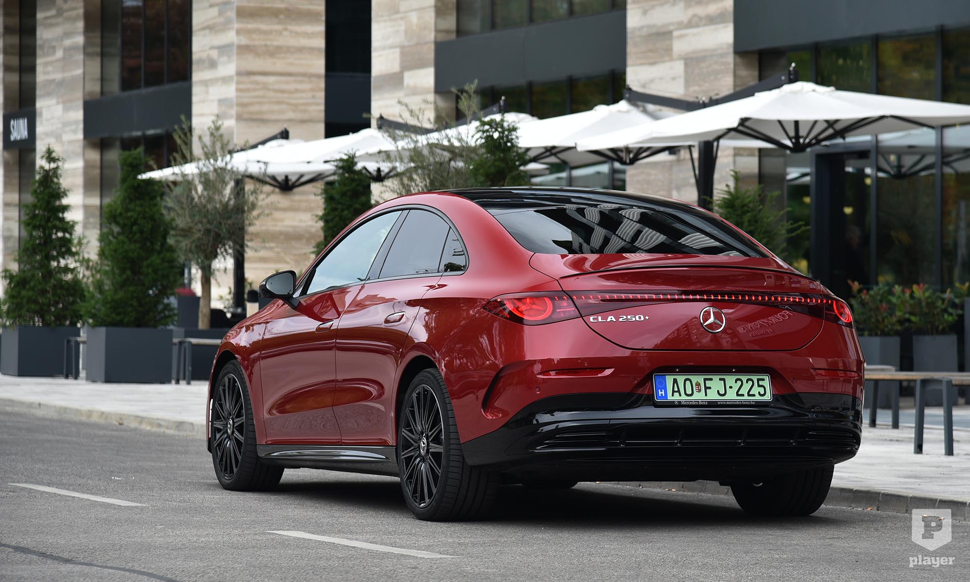 A CLA első generációja egy rosszul sikerült CLS-kicsinyítés volt, a második generációnál rengeteget javultak az arányok, a harmadik minden irányban nagyobb lett, de lényegében hasonló a karosszéria, ami azért nem evidens, mert az elektromos változat akkuinak is el kell férniük, ez a szükségszerűség pedig sok autó formáját tette már tönkre. A CLA megmenekült, méghozzá úgy, az utastér padlója sincs zavaróan magasan, és a csomagtartó is értelmezhető méretű, 405 literes, ráadásul elöl is van még egy százliteres frunk. A hátsó utasoknak sem kell szenvedniük, mert bár az A-ra végződő típusnevek a Mercedes-skálán a legkisebb autókat jelölik, az új CLA 4,72 méter hosszúságú – hosszabb, mint az előző C osztály kombiváltozata, szóval egyáltalán nem kicsi.