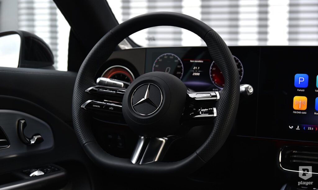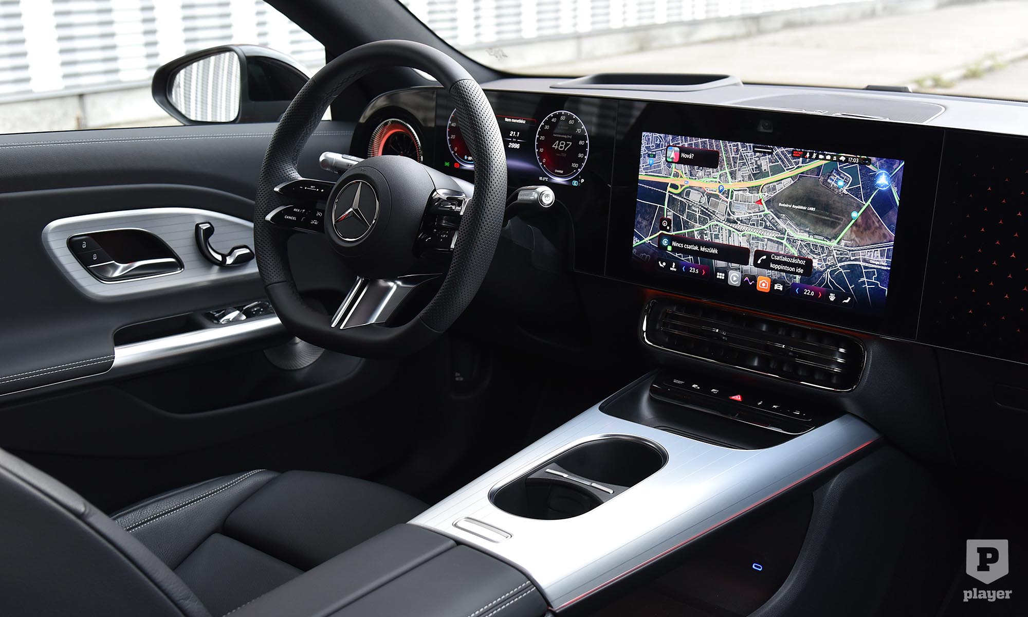 Akiket a csillagfényes külső fog meg, biztosan ilyen belsőt várnak el: azért nem mondhatjuk, hogy az autó teljes szélességében húzódik a vezető felé hat fokkal döntött monitorcsík, mert az utas előtt ún. „digitális díszítőelem” található, ami nem monitor, hanem rengeteg világító csillag, de a konfigurátorban már rendelhető oda is egy 14 colos érintőképernyő. A hangulatfények részeként a turbinadizájnos légbeömlők is világítanak, egy fokkal kevésbé zavaróan, mint az 1-es BMW-ben, mert a CLA-ban nem a külső visszapillantó magasságában tükröződik az oldalüvegben, hanem kicsit magasabban.