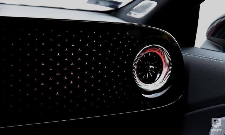 Ez tényleg sok, de… – állapítottam meg élőben. A Mercedes beismerte a kudarcot, és az EQ-ra keresztelt külön modellsorozat helyett inkább már ők is egy osztályon belül kínálják a belső égésű motorral szerelt és a teljesen elektromos változatokat, és csak néhány részlettel fejezik ki az elég alapvető különbséget. A CLA és a villanyos CLA EQ között a legfeltűnőbb ilyen részlet a hűtőmaszk, ami előbbinél rendes, légáteresztő elem – hiszen mögötte ott a benzinmotor hűtője –, a villanyosnál csak dísz. Ha viszont dísz, akkor legyen DÍSZ, gondolták a tervezők, úgyhogy a középen lévő méretes emblémán kívül még 142 darab apró, világító csillagot szórtak szét.
