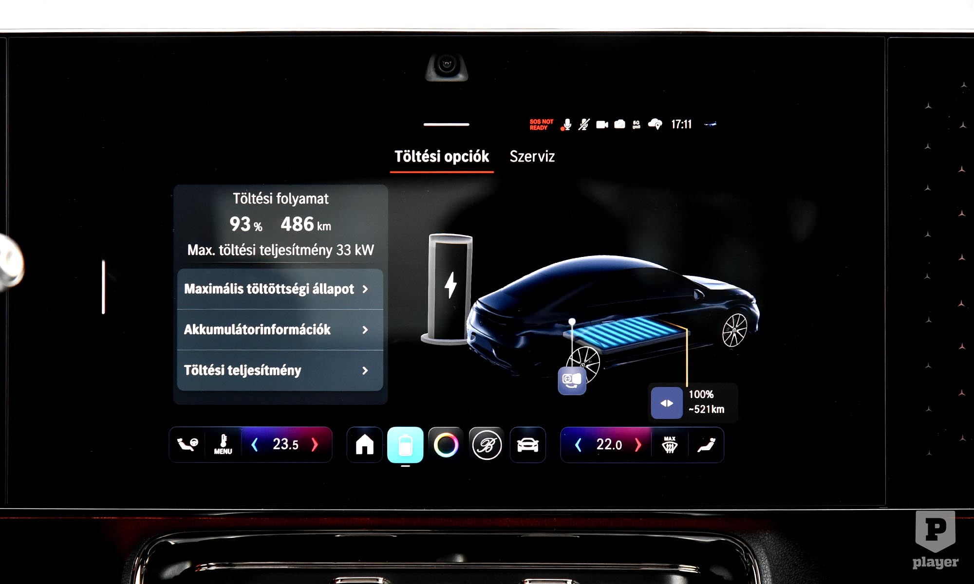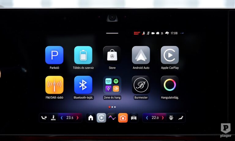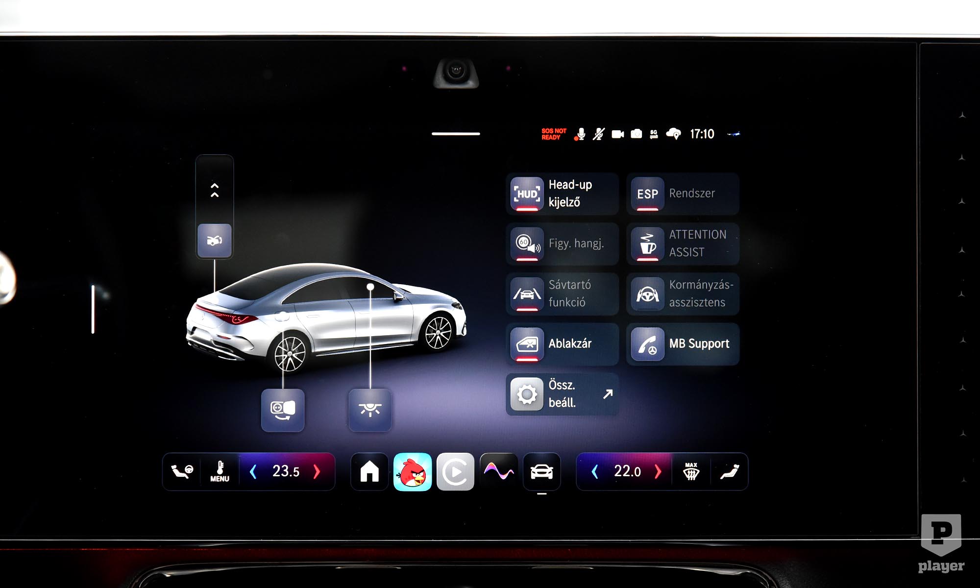 Minden autóban fontos az utastér nívója és hangulata, hiszen a saját kocsinkat normális esetben többet nézzük belülről, mint kívülről, a CLA viszont számos szolgáltatással is tesz azért, hogy akkor se akarjunk kiszállni, ha épp nem megyünk sehová. Ennek csak részben oka, hogy egy elektromos autót időnként útközben is töltjük, mert ez a CLA-ban nem feltétlenül tart sokáig: akár 320 kilowattal is tölthető a CLA 250+ EQ nettó 85 kilowattórás lítium-ion aksija, így autópályán elég lehet néhány száz kilométerenként megállni egy kicsit, ami egyébként is jólesik. Előfordulhat az is, hogy az autóból kell bejelentkeznünk egy videókonferenciára – ehhez segítség a középső monitor feletti, széles látószögű szelfikamera –, az pedig tényleg bármikor ránk törhet, hogy azonnal Angry Birds-özni, youtube-ozni vagy Disney Plus-ozni akarunk, a CLA-ban bármelyikre van lehetőségünk.
