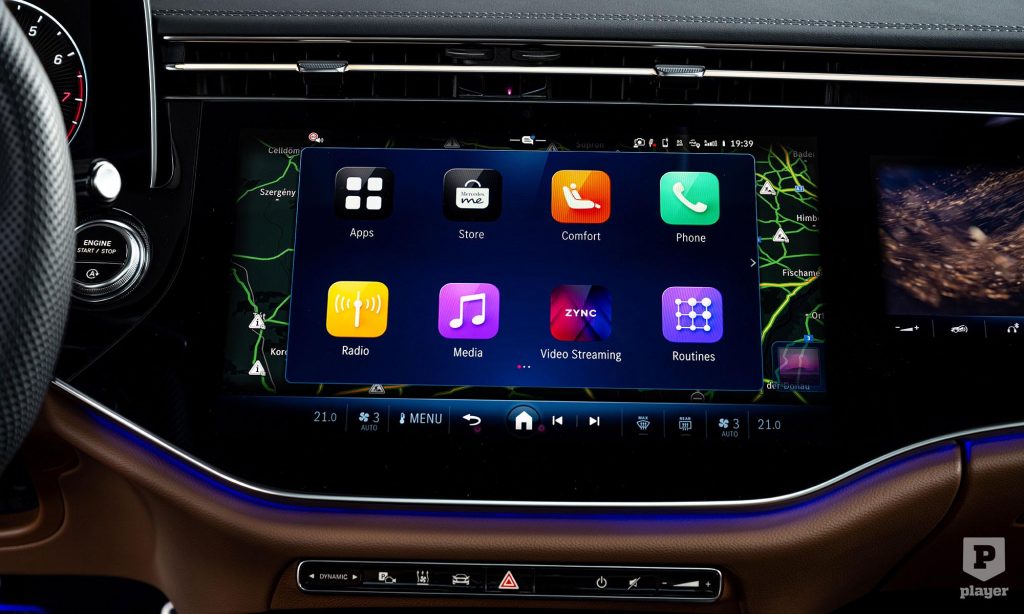 Az MBUX Superscreen tudása lenyűgöző. A szelfikamera felismeri a sofőrt, és lehetővé teszi, hogy a napindító meetinget az autóból vezessük le, persze szigorúan csak álló helyzetben. Ugyanilyen szigor vonatkozik arra is, hogy a vezető nem láthatja az anyósülés előtti képernyőt, ha videót, tévét vagy TikTok-tartalmat fogyaszt az utas. Az autózást kevésbé élvező első utas pedig biztosan nagy hasznát veszi a rosszullétet megelőző funkciónak. Az okos rendszer finoman hátradönti az ülést, beigazítja a párnákat, és hűs levegővel igyekszik elejét venni a gyomortartalom-átrendezésnek.